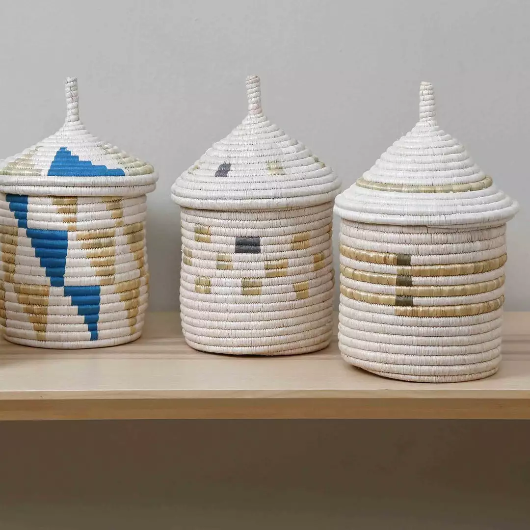 These baskets are accented with minimalist designs in colorful threads giving them a modern look, perfect for adding a handmade element to a contemporary space. Truly a purchase with purpose, every sale of these baskets directly benefits a refugee woman weaver and her family.
