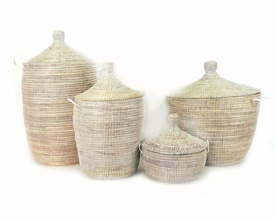 A stylish storage solution, this medium white basket has both practical functionality and contemporary style. This basket looks great with the other two-tone baskets in the set as a focal point in any room. Wolof women in rural Senegal weave these baskets from millet grass, and colorful plastic threads which add strength and durability.