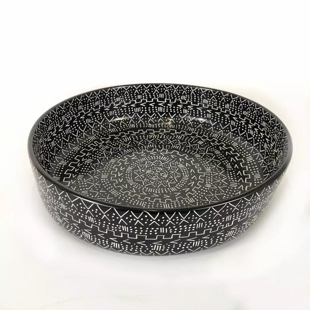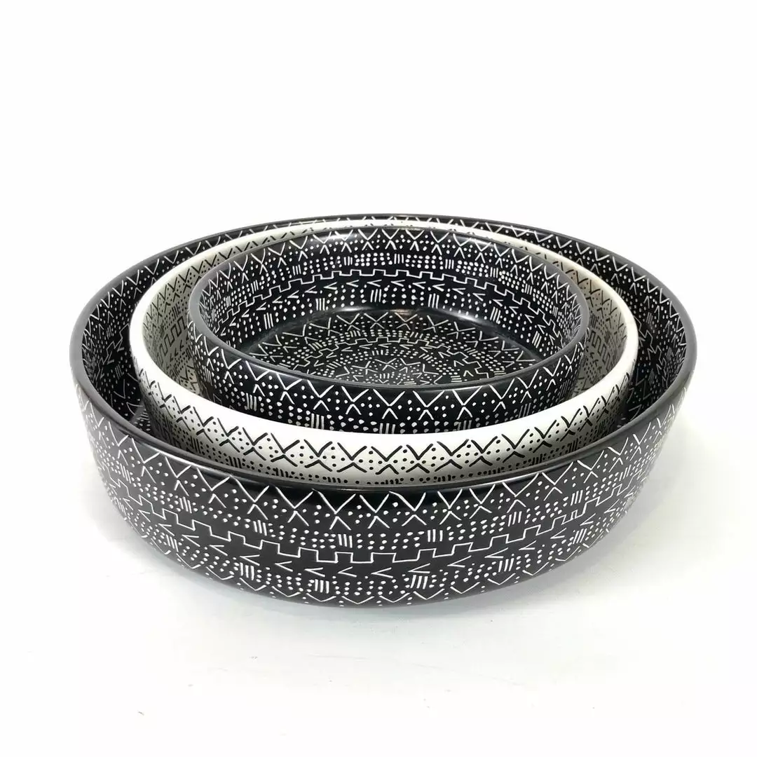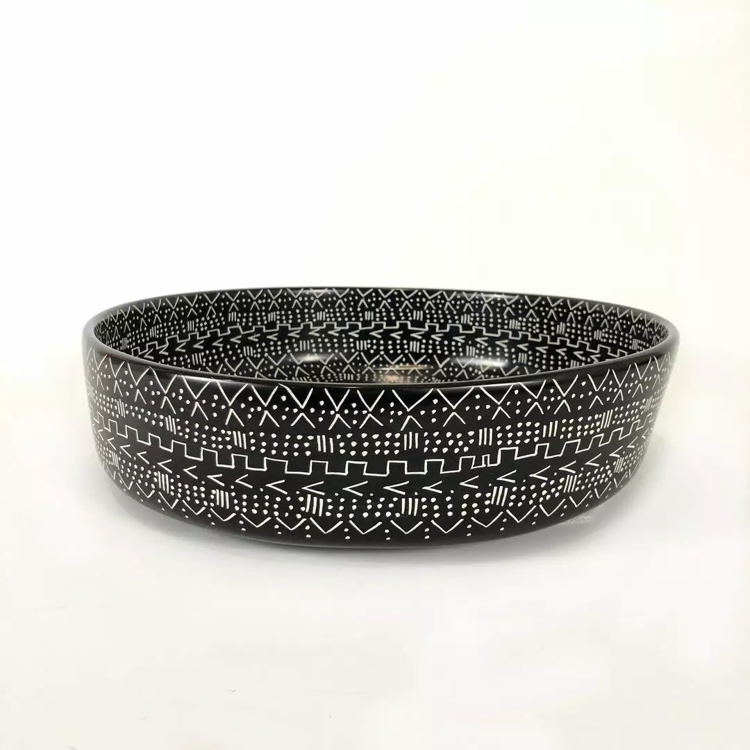 These large bowls are entirely carved by hand from a single piece of soapstone by talented artisans in Kisii, Kenya. After the carving process they get polished, dyed and decorated with a mud cloth design. They look great together on a tabletop with the other mud cloth bowls in this series, and make a fantastic centerpiece.