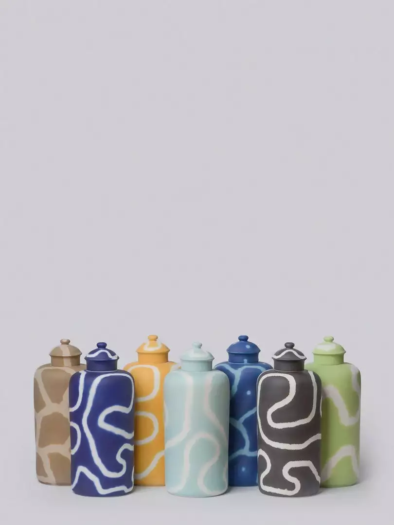 From left latte, indigo, yellow, celadon, mountain lake, black, and apple green.