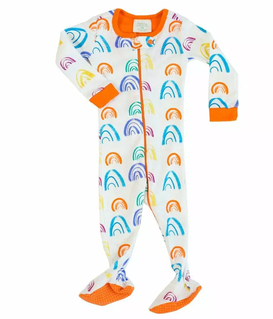 This easy zip-up footed onesies was designed with a dash of adventure. Orange accents in the cuffs, neck, zipper and feet. Grippy feet make exploration safe and fun while the soft organic cotton adds ultra comfort.