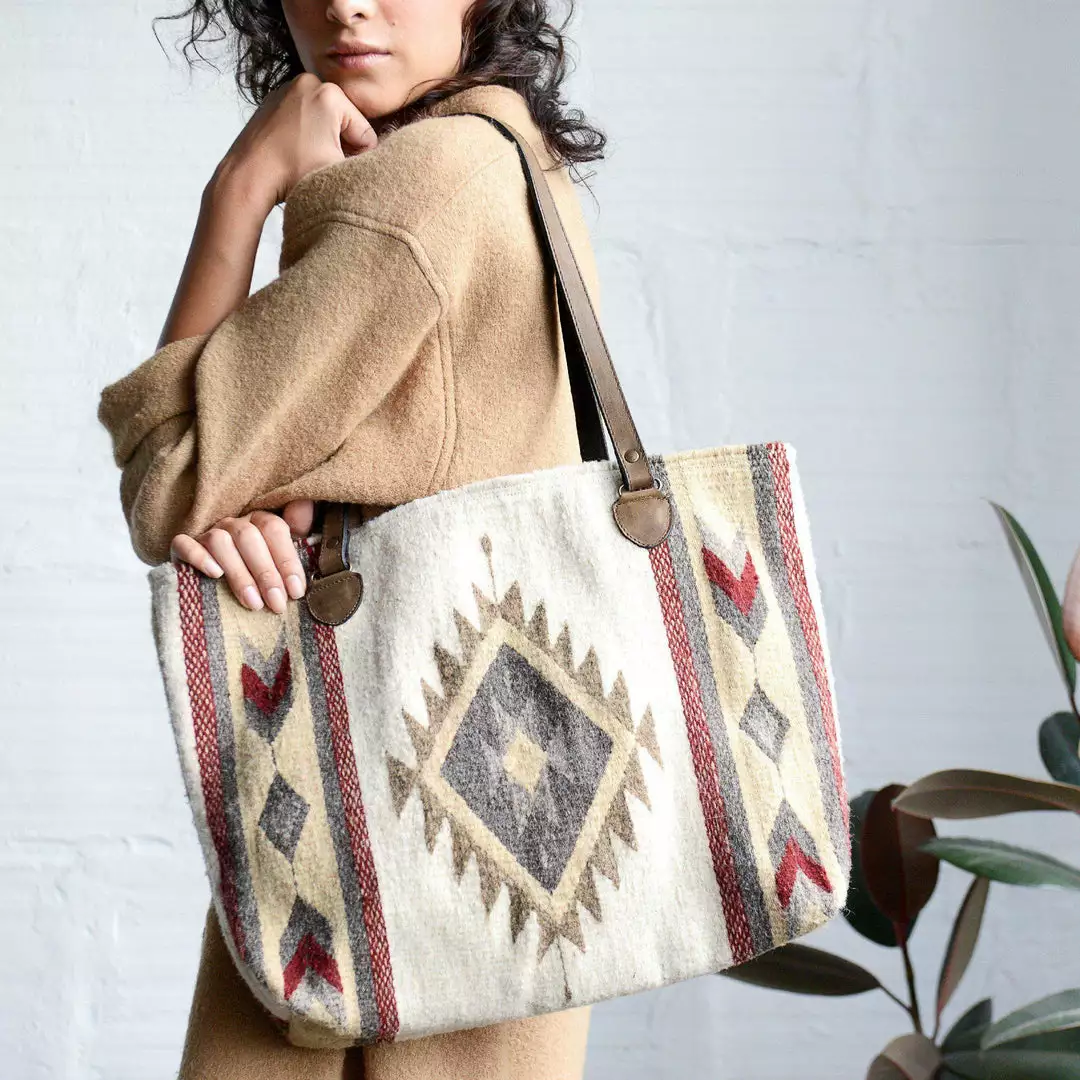 The Snowflake pattern features a Zapotec diamond and arrow design in cranberry red, soft gold, and green on natural cream wool.