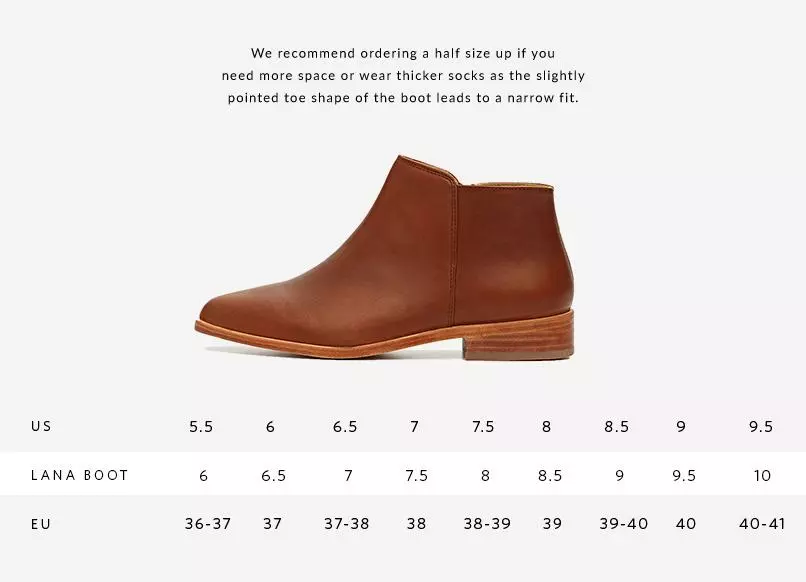 It’s recommended to order a half size up if you need more space or wear thicker socks as the slightly pointed toe shape of the boot leads to a narrow fit.