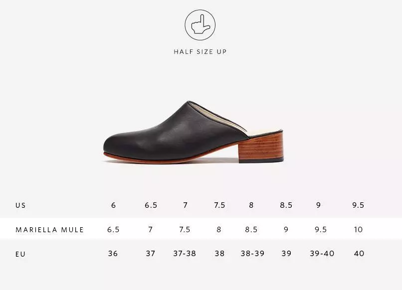 It’s recommended to size up a half size unless you have narrow feet. After a few wears, these mules should soften up so that it becomes easier for your toes to slip in all the way to the end.
