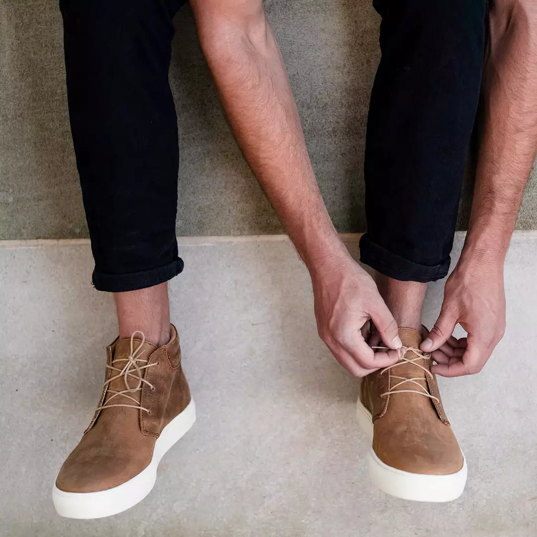 The Cortez Mid Top Sneaker combines a classic chukka boot look with the comfort and versatility you expect from a sneaker. It features a Vibram sole, soft leather insole and lining, smooth leather upper, and comes equipped with two types of laces, both cotton and waxed cotton, to fit your style. Handmade in an ethical factory in León, Mexico.