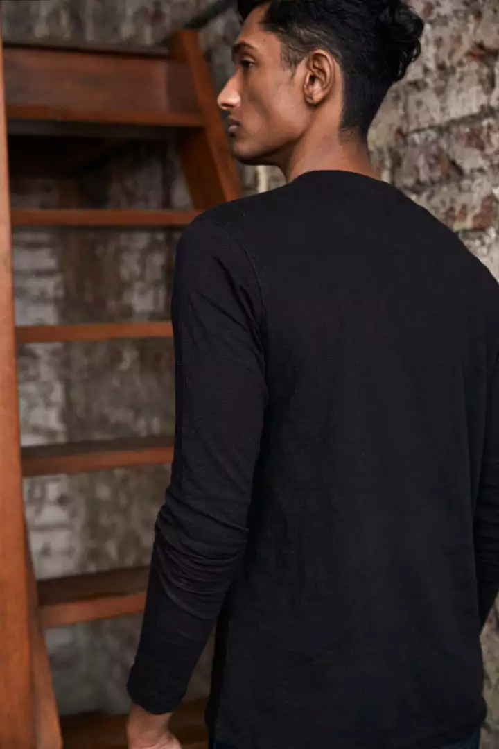 A classic henley cut in a slim fit, which can be stylish or nonchalant, depending on how you pair this lounge-y essential. The subtly textured slub fabric adds a distinctive touch, while the slightly wide neckline complements its athletic fit. Finished with coconut shell buttons.