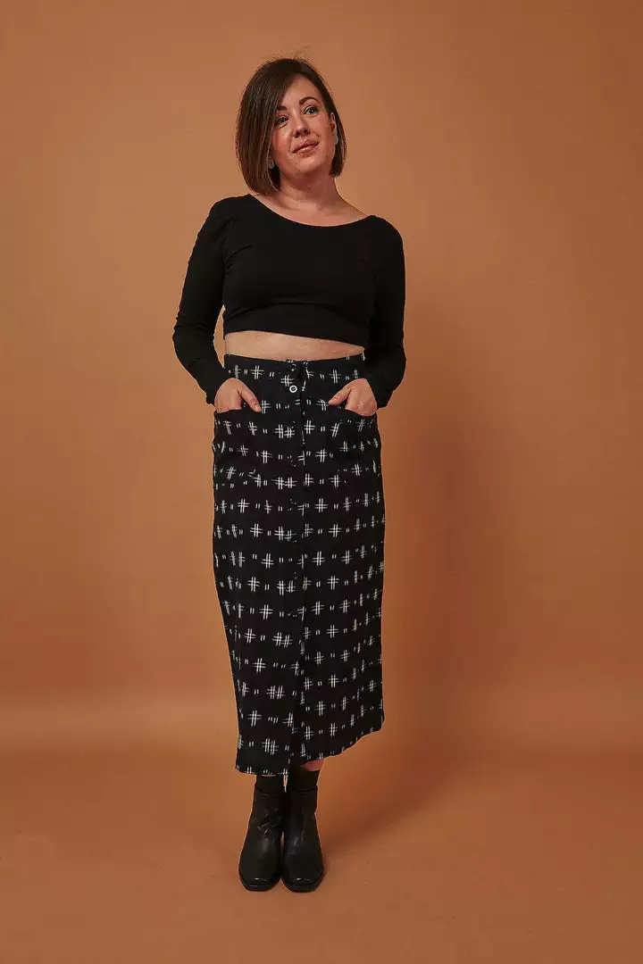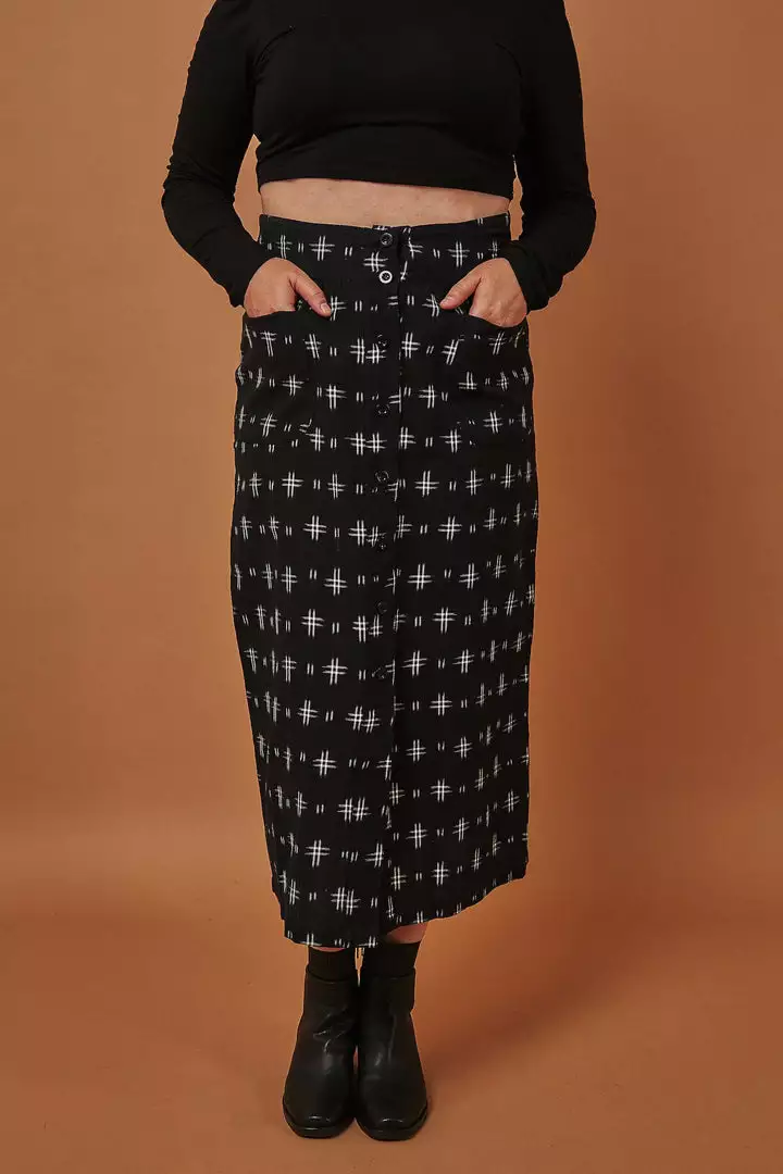 Three words to describe this black button-up skirt: classic, vintage and versatile. Pair with a t-shirt or blouse and you are ready for gallery openings, work parties, or cocktails with friends. Buttons down the front to create a clean, sophisticated look that leaves a lasting impression. Your purchase helps provide a secure job with fair wages and a positive working environment to artisans in India and the United States.