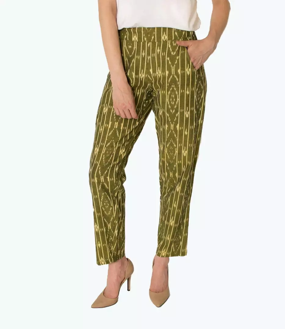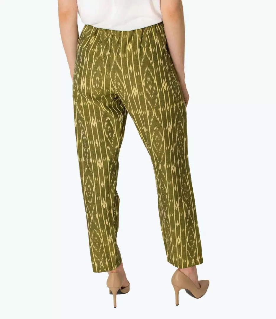Olive green is the new neutral. Perfect for the fall season. These pants are made from a beautiful handwoven ikat fabric in a fair trade environment. Pair them with a simple white blouse and accessories and you are ready for your next lunch date or even work meeting. These pants feature pockets for those who want to go minimal and leave the purse behind. Tapered toward the bottom of each leg and hitting at the ankle, these pants make anyone’s legs look instantly longer, not to mention more fashionable.