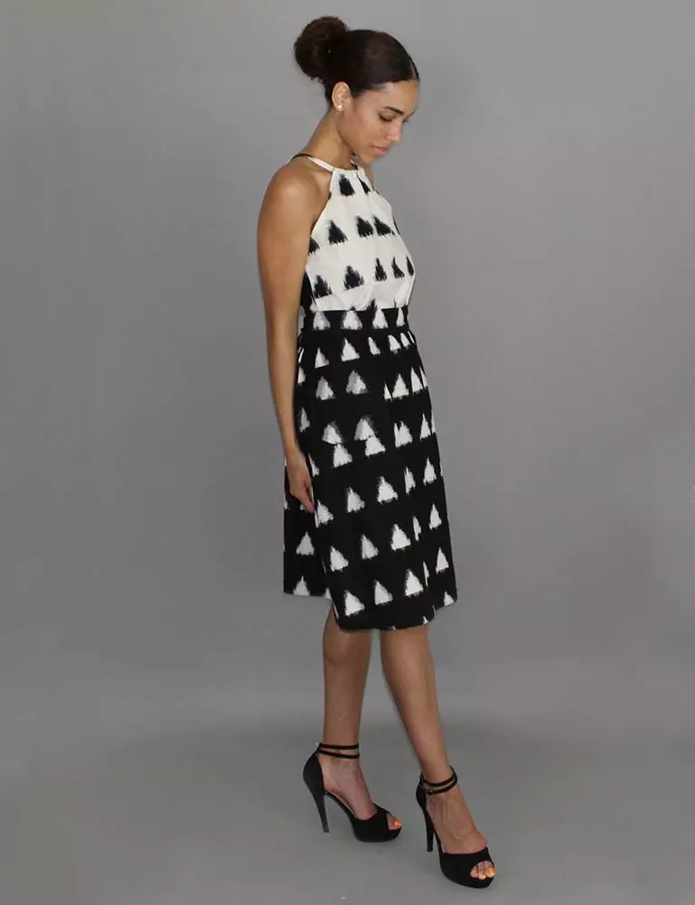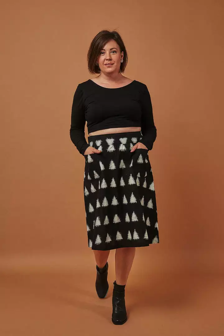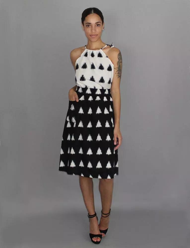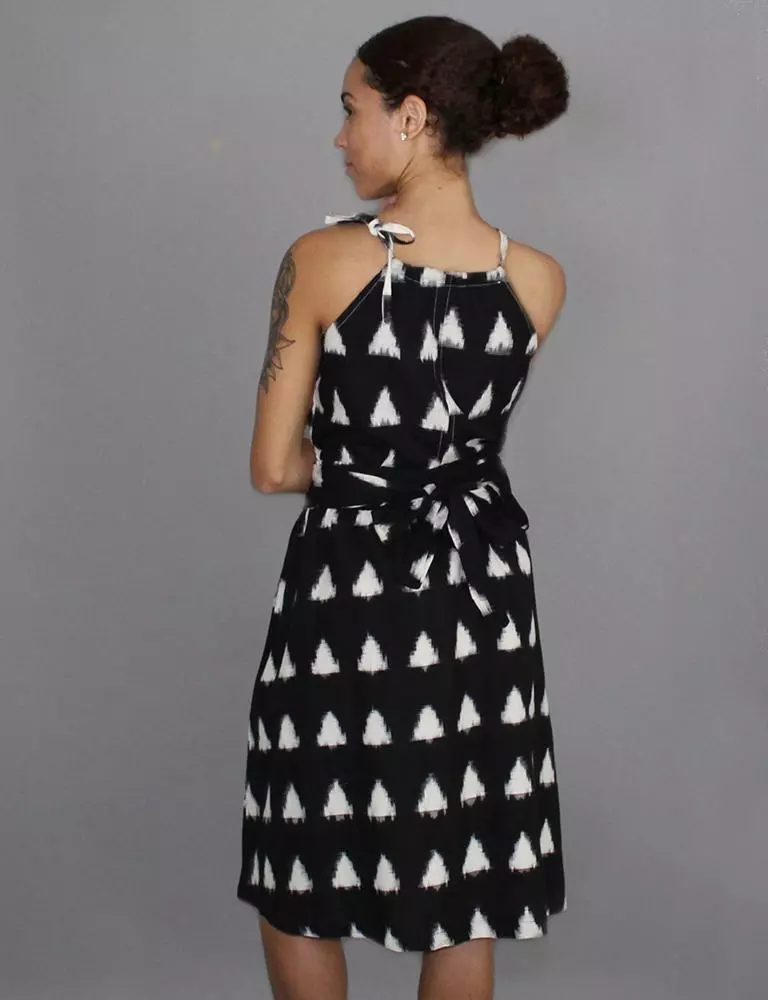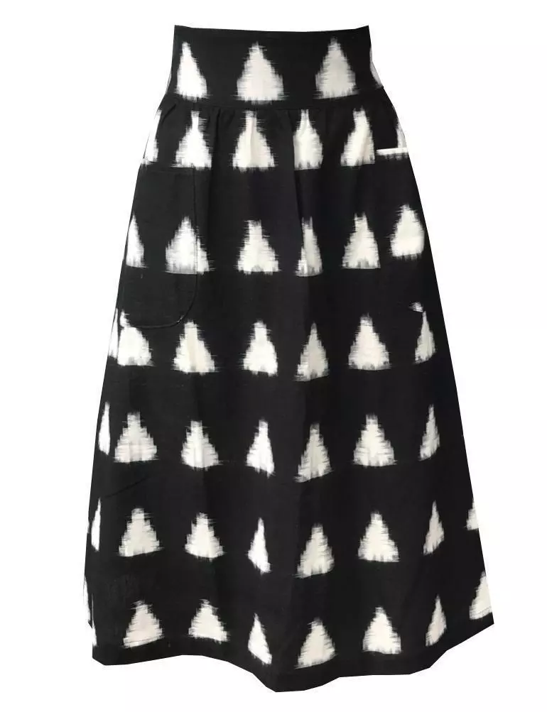 This black and white midi skirt hits just below the knees and features a flat front waistband, elastic in the back and ties that can be tied in the front, side or back. Your purchase helps provide a secure job with fair wages and a positive working environment to artisans in India and the United States