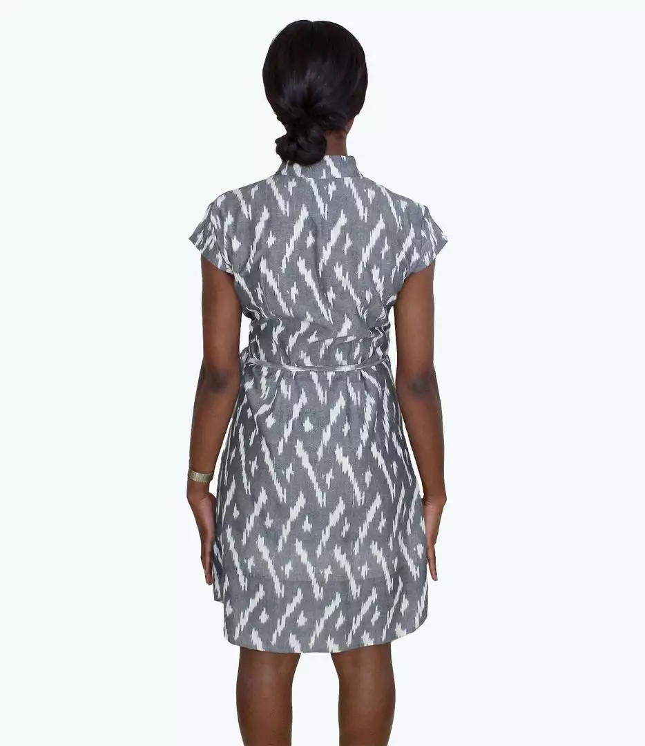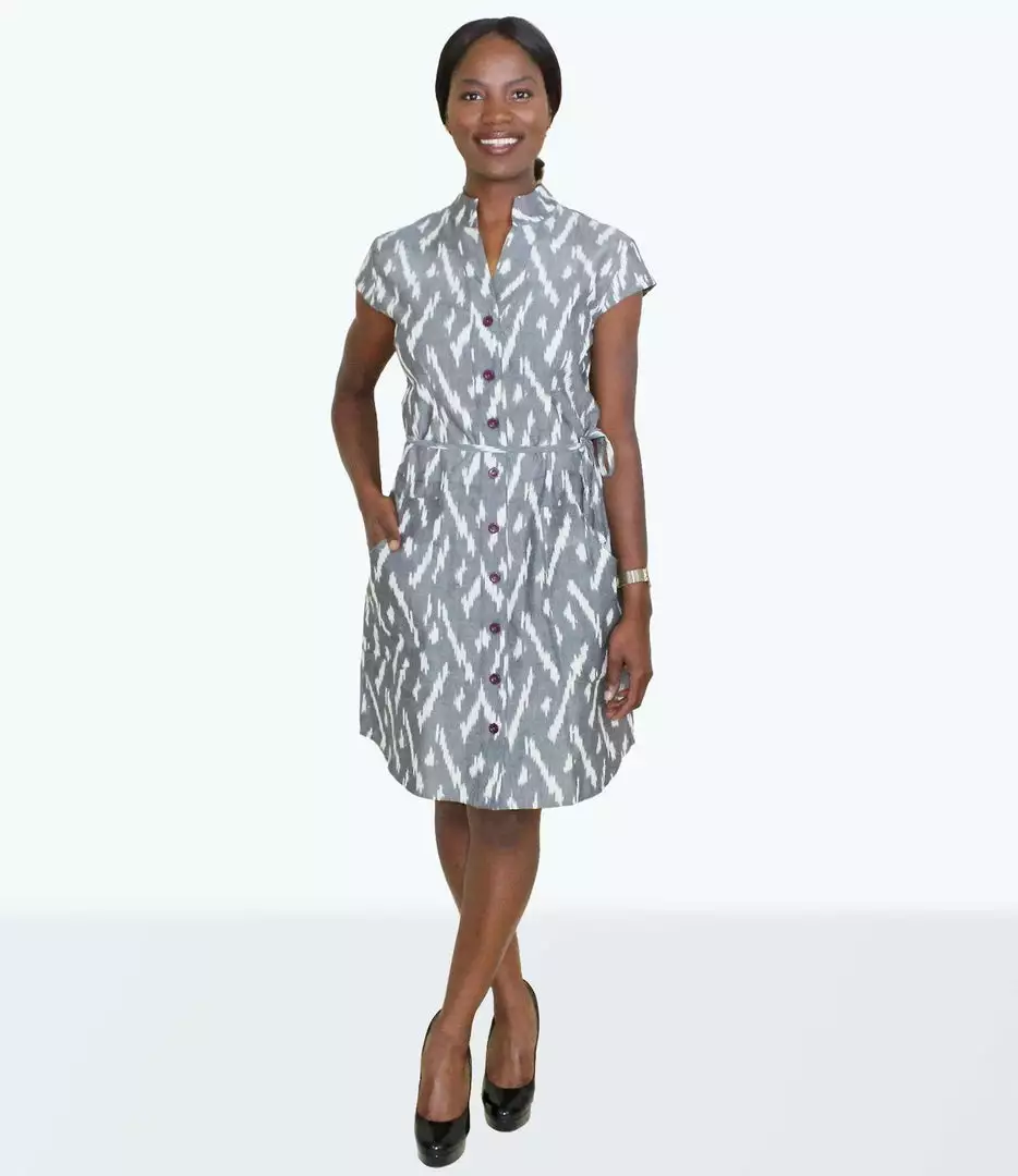 This Dress has a professional cut but still comfortable for all-day wear. A button-up dress with a stand-up collar, cap sleeves, an optional black fabric belt, and side pockets. Your purchase helps provide a secure job with fair wages and a positive working environment for artisans in India and the United States.