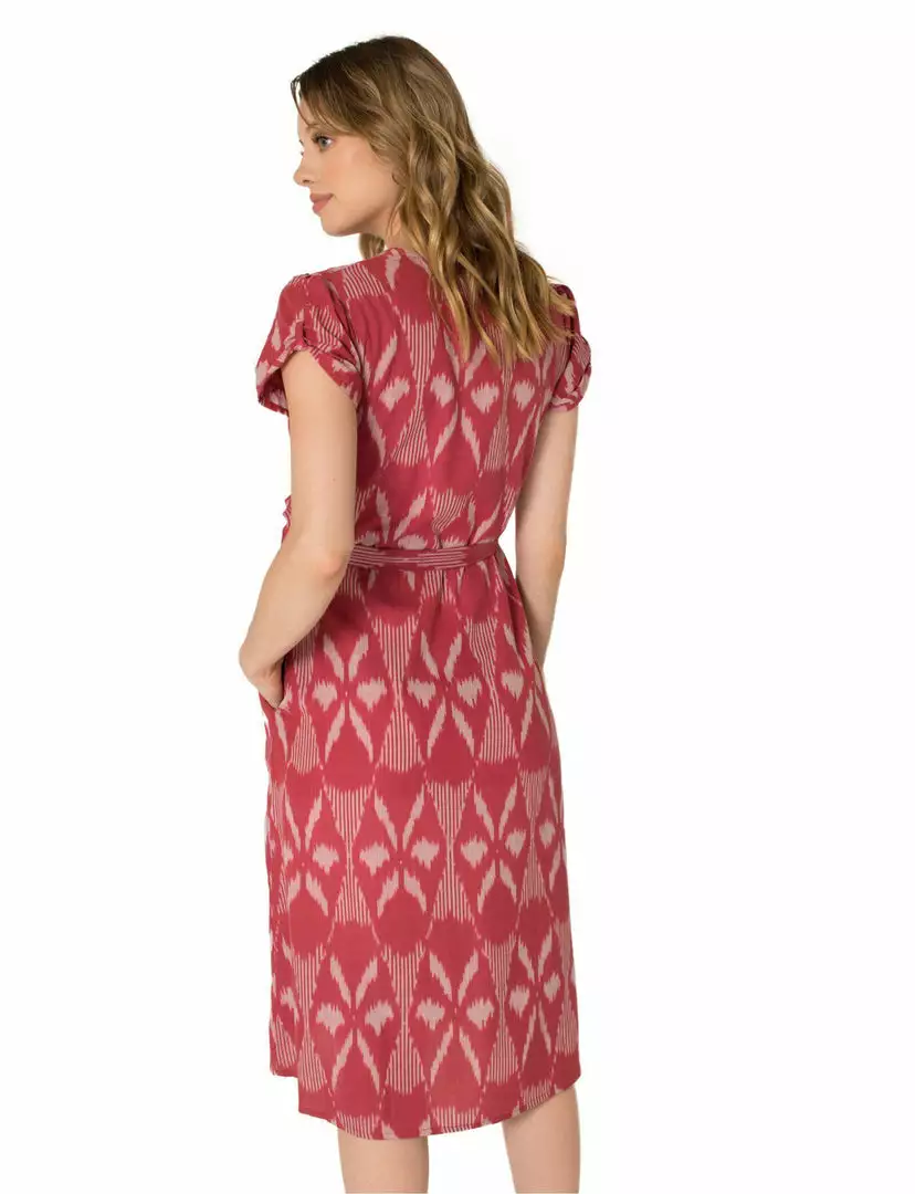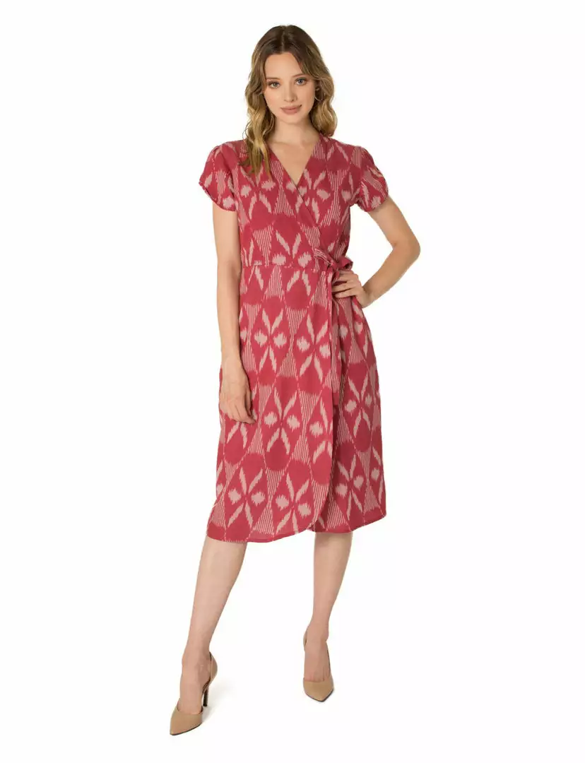 Holiday parties just got even more special in the Garnet Wrap Dress. Just add a cute pair of black heels, a black cardigan and you will have the perfect look mixing modern and vintage. This wrap dress in a lovely garnet red ikat fabric hits at mid-calf, features a hook n’ eye closure at the bust to prevent slippage and of course side pockets.