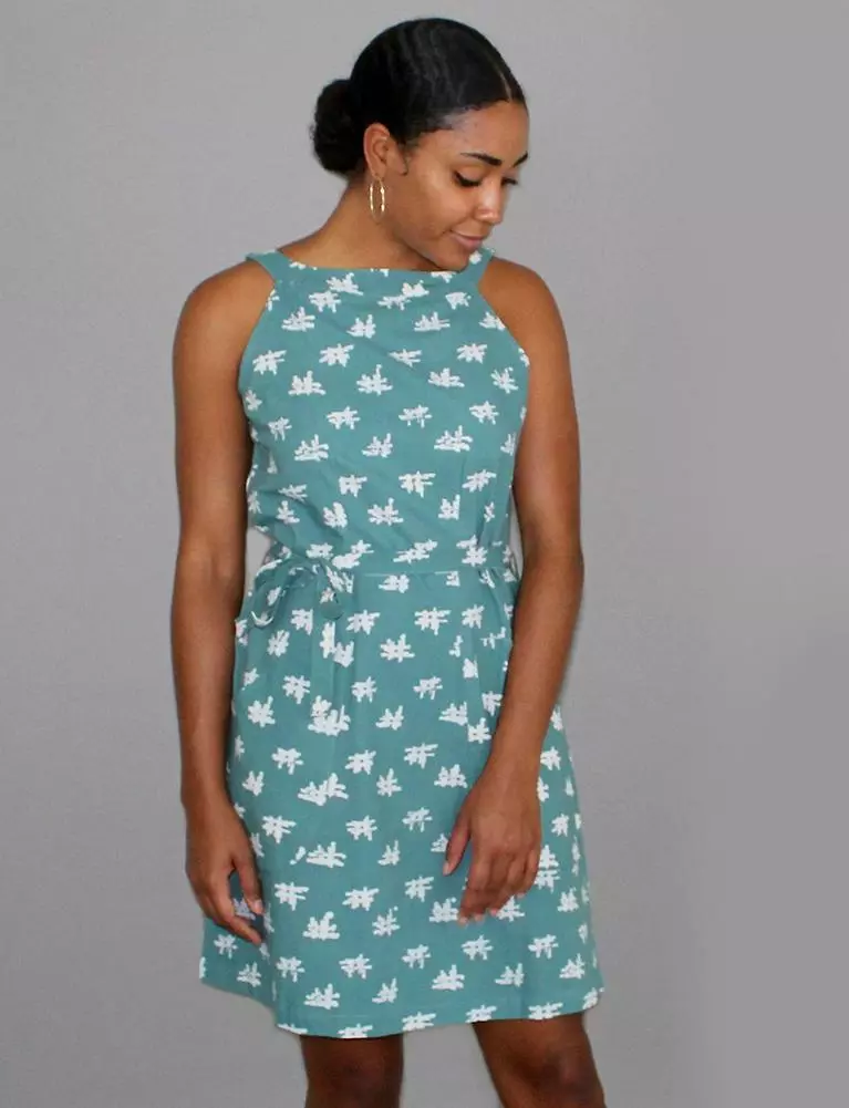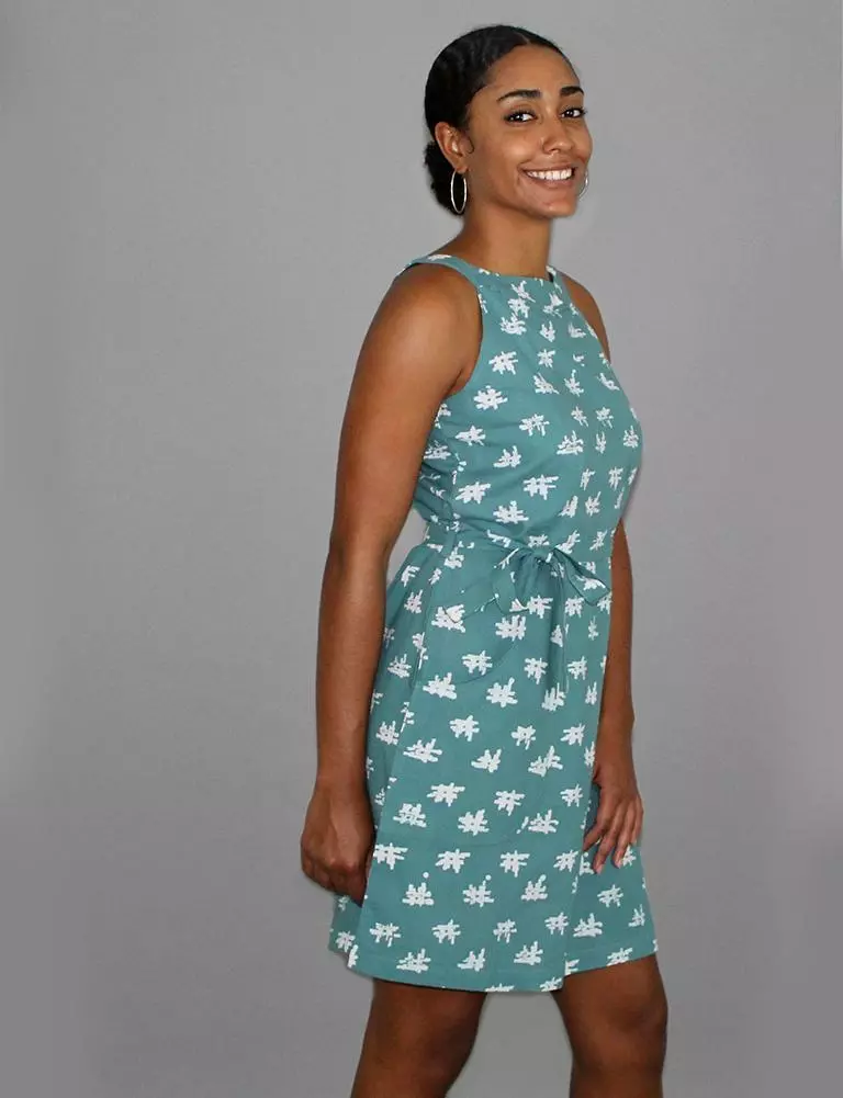 Made of organic woven cotton, this easy, breezy dress is sleeveless and includes pockets for comfortable wearing. You can wear this dress anywhere, from the office to the beach. With its beautiful white pattern and fabric belt, simply add a hat or pair it with jewelry for a simple, stylish outfit. Your purchase helps provide a secure job with fair wages and a positive working environment to artisans in Bangalore, India.
