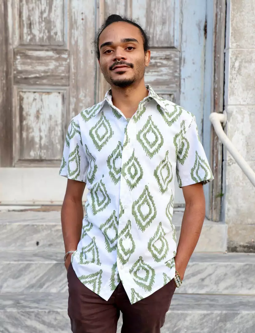 The Palm Village short-sleeve shirt is perfect for spring gatherings with its bright patterns, straight and narrow profile, and broad shoulder fit. This cheery button down is an elevated casual look that can be dressed up. Due to the handmade nature of these products there may be a 5-10% shade variation from the picture of the garment to the actual product you receive.