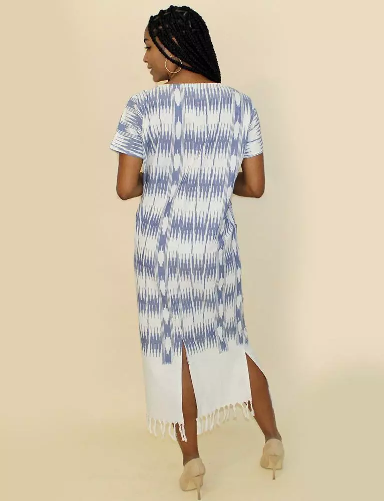 Slip on the cool and comfortable cotton Neoma Kaftan. With tassels at the bottom, you will be ready for beach vacations and boardwalk strolls. This Kaftan features dolman sleeves, side, front and back slits for extra comfort, and big front pockets. Your purchase helps provide a secure job with fair wages and a positive working environment to artisans in India and the United States.