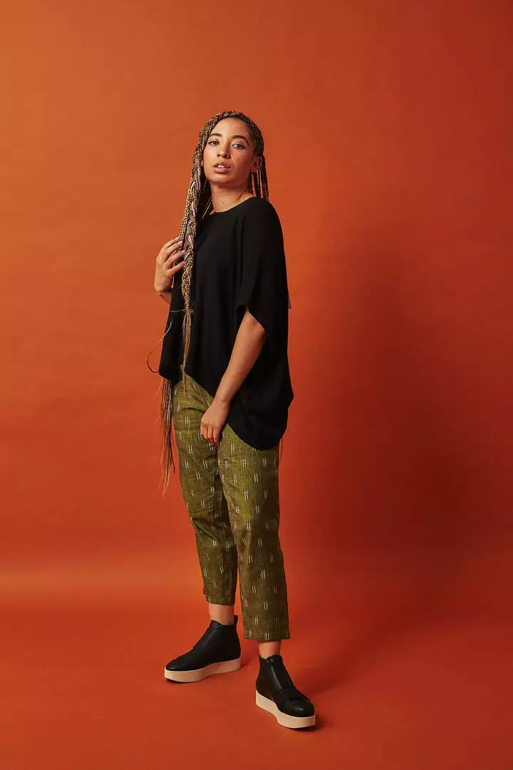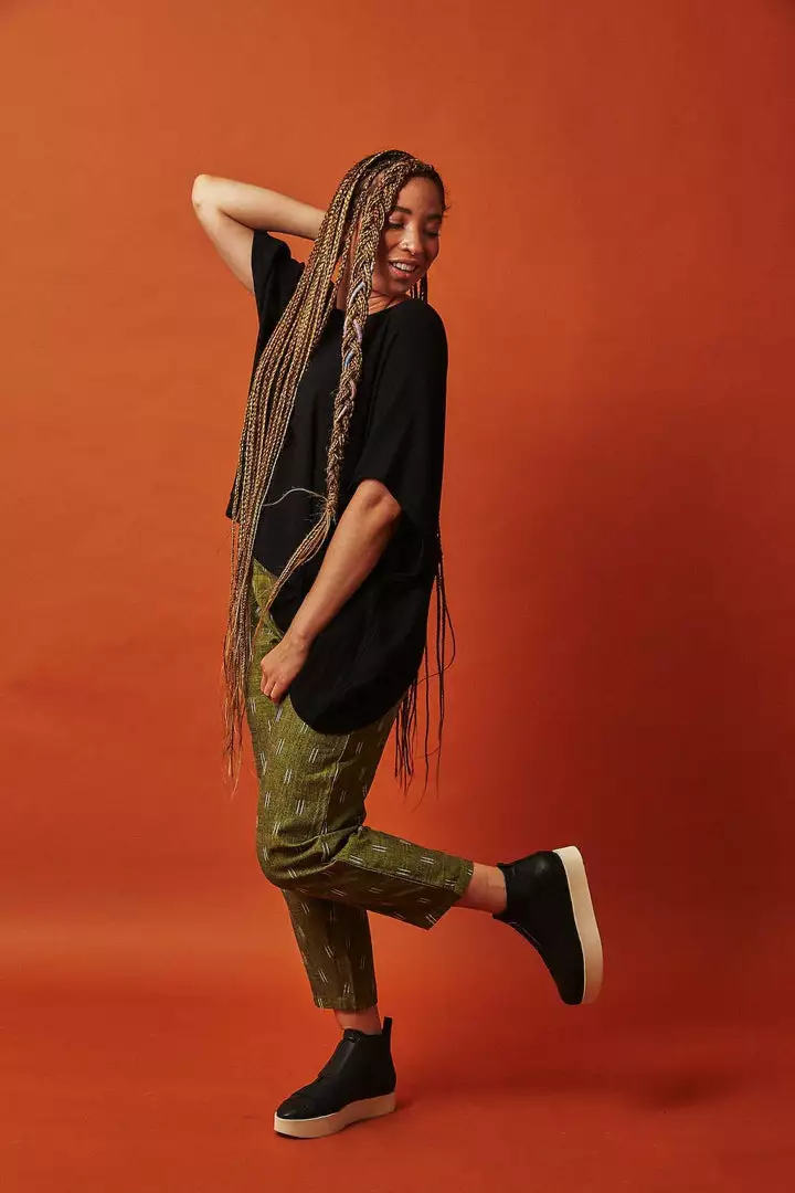 Olive green is the new neutral. These crop pants are made from a beautiful handwoven ikat fabric in a fair trade environment. Pair them with a simple white blouse and accessories and you are ready for your next lunch date or even work meeting. Tapered toward the bottom of each leg, these pants make anyone’s legs look instantly longer. Your purchase helps provide a secure job with fair wages and a positive working environment to artisans in India.