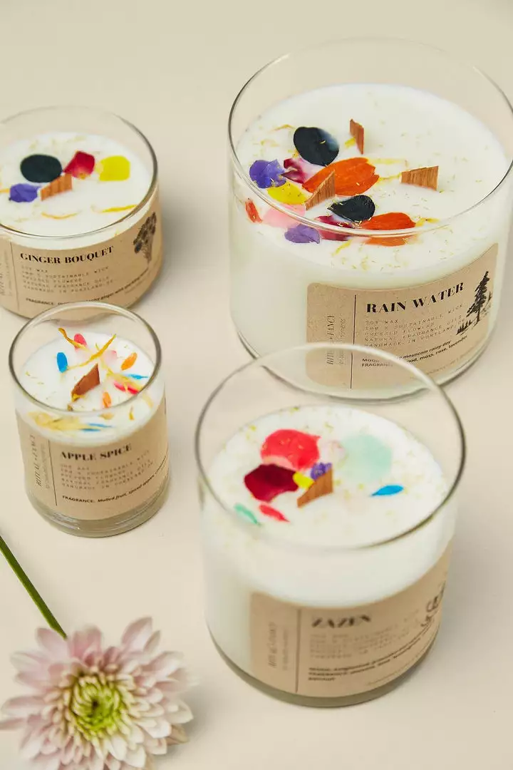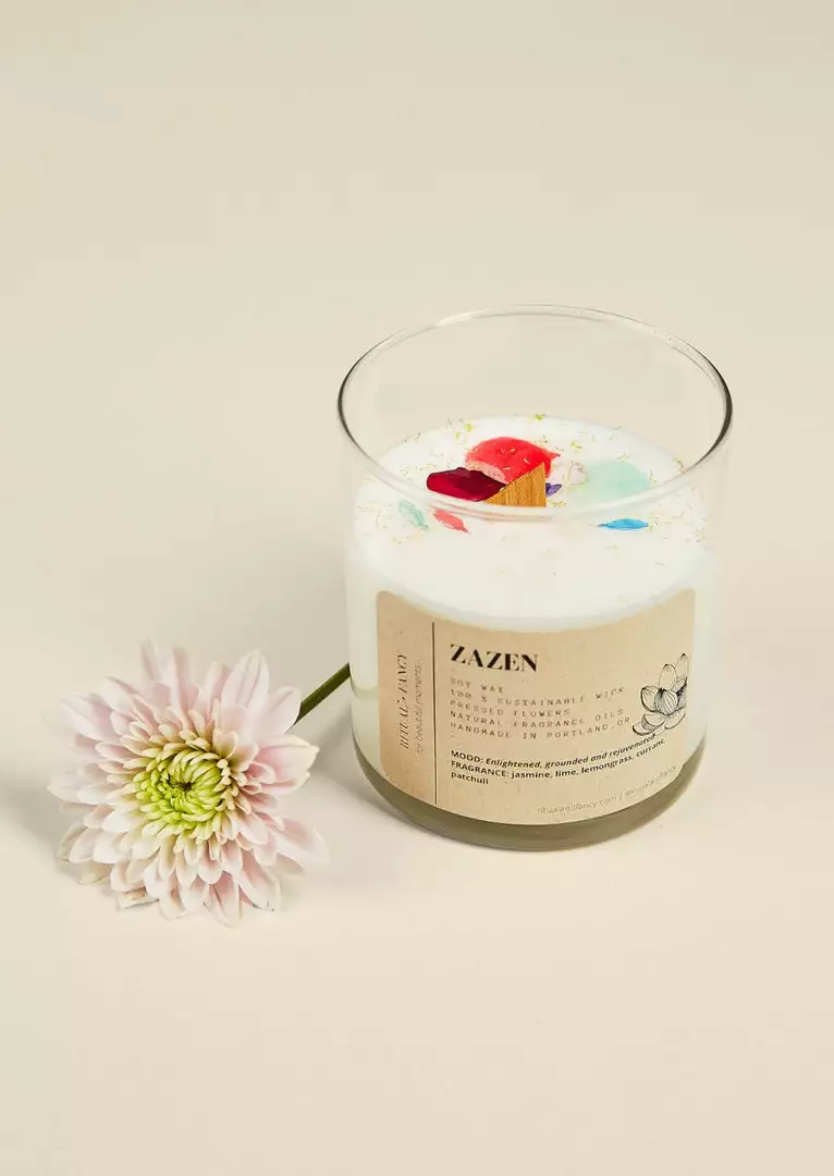 Ritual + Fancy hand-poured candles are made in small batches with 100% soy wax, natural cotton / wood wicks, dried flowers, and pure essential oils. All candles feature one-of-a-kind floral designs, burn clean and emit healing aromatherapy fragrances free of phthalates, lead, dyes, parabens and other nasty additives.