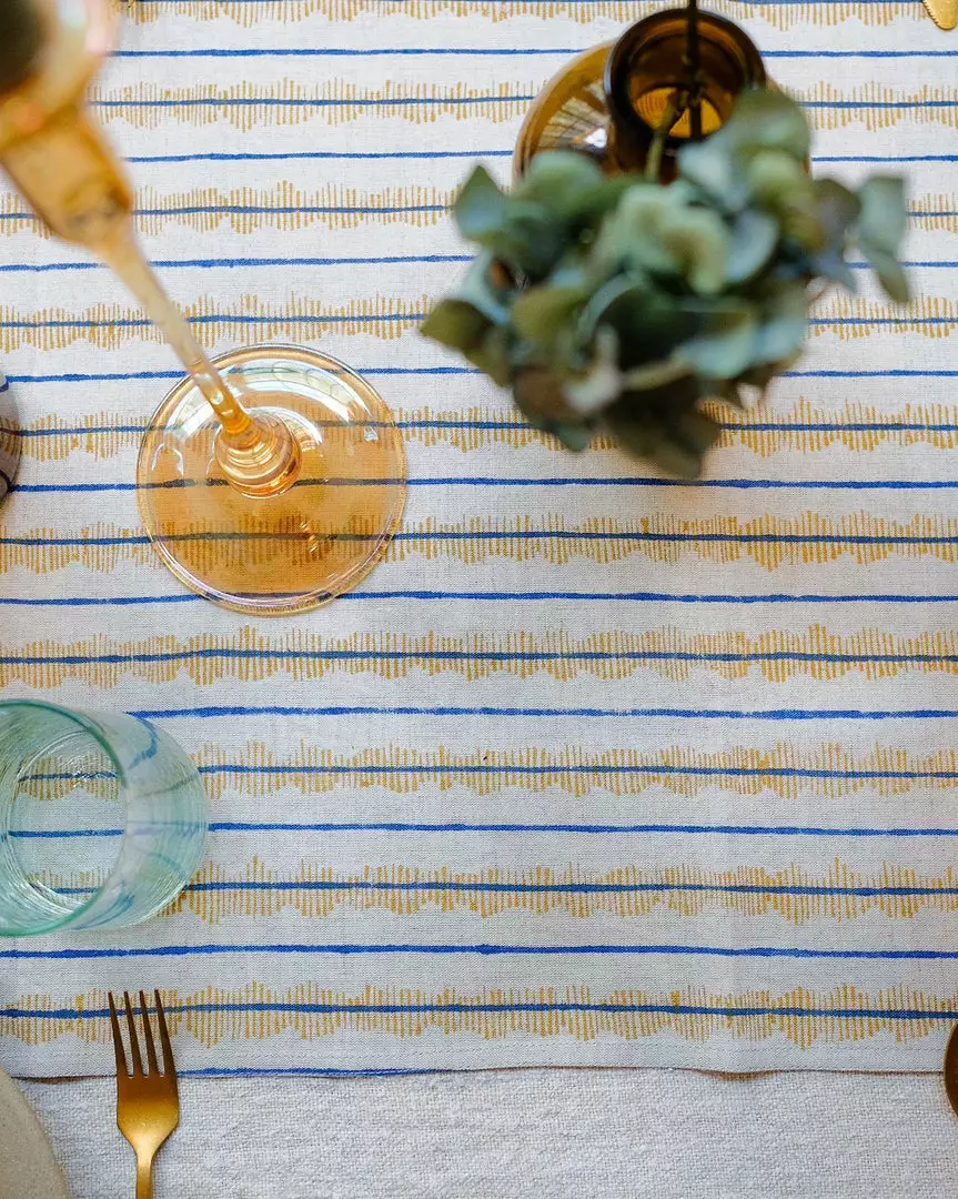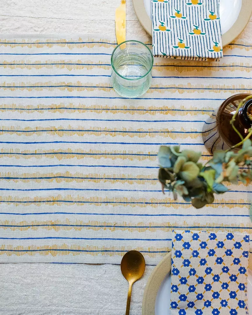 The Sanya Table Runner adds a delicate and joyful pop of color to your table. Each is hand block printed by master artisans in villages outside of Jaipur. The design is inspired by the romantic, poetic feel of the city of Udaipur. Slight nuances are to be expected with handcrafted textiles.