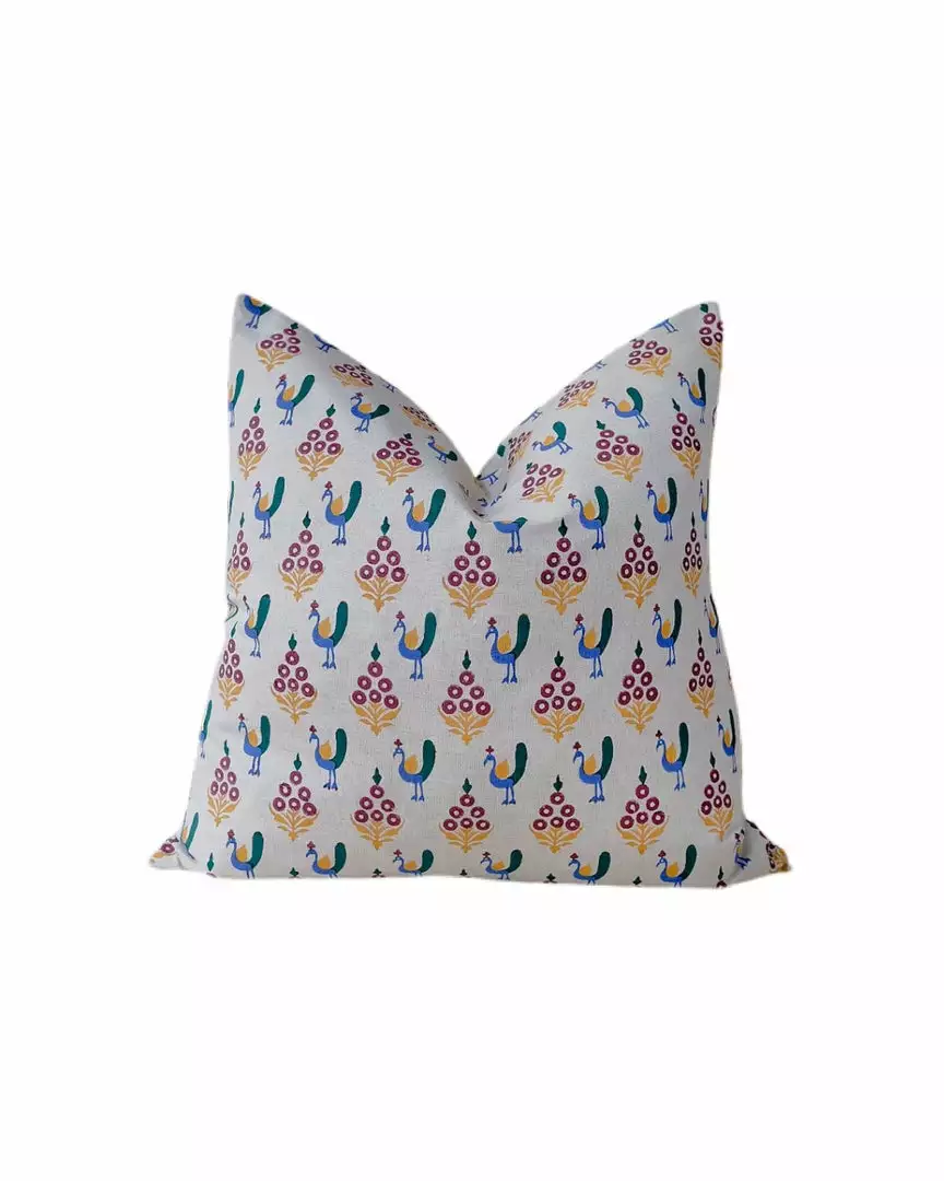 The Vani Linen Throw Pillow is hand block printed by artisans in a small village outside of Jaipur. The bright, joyful design is inspired by the romance and poetic feel of Udaipur. Subtle nuances are to be expected with handcrafted textiles.