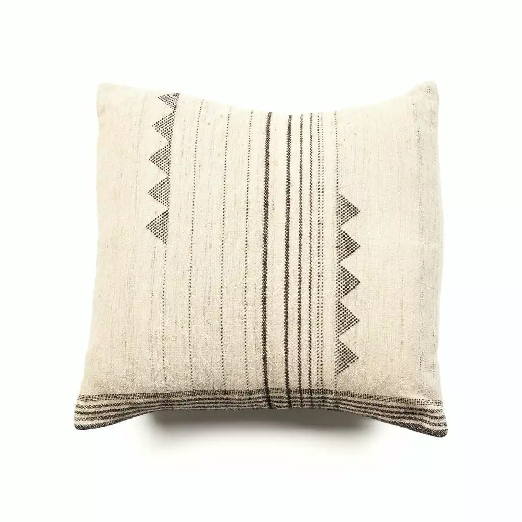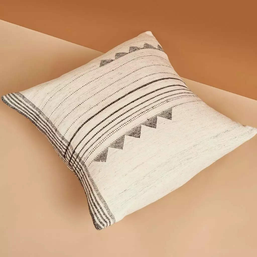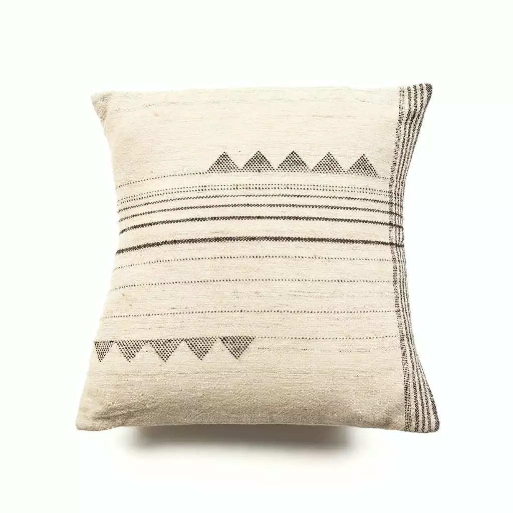 The Kora Throw Pillow is a slightly textured, handwoven pillow with skillfully blended handspun silk, wool and organic cotton yarns. Its design stands out with the use of undyed yarns that allow the texture of the natural yarn to becomes its own design element. Kora means ‘raw’ in Hindi language.