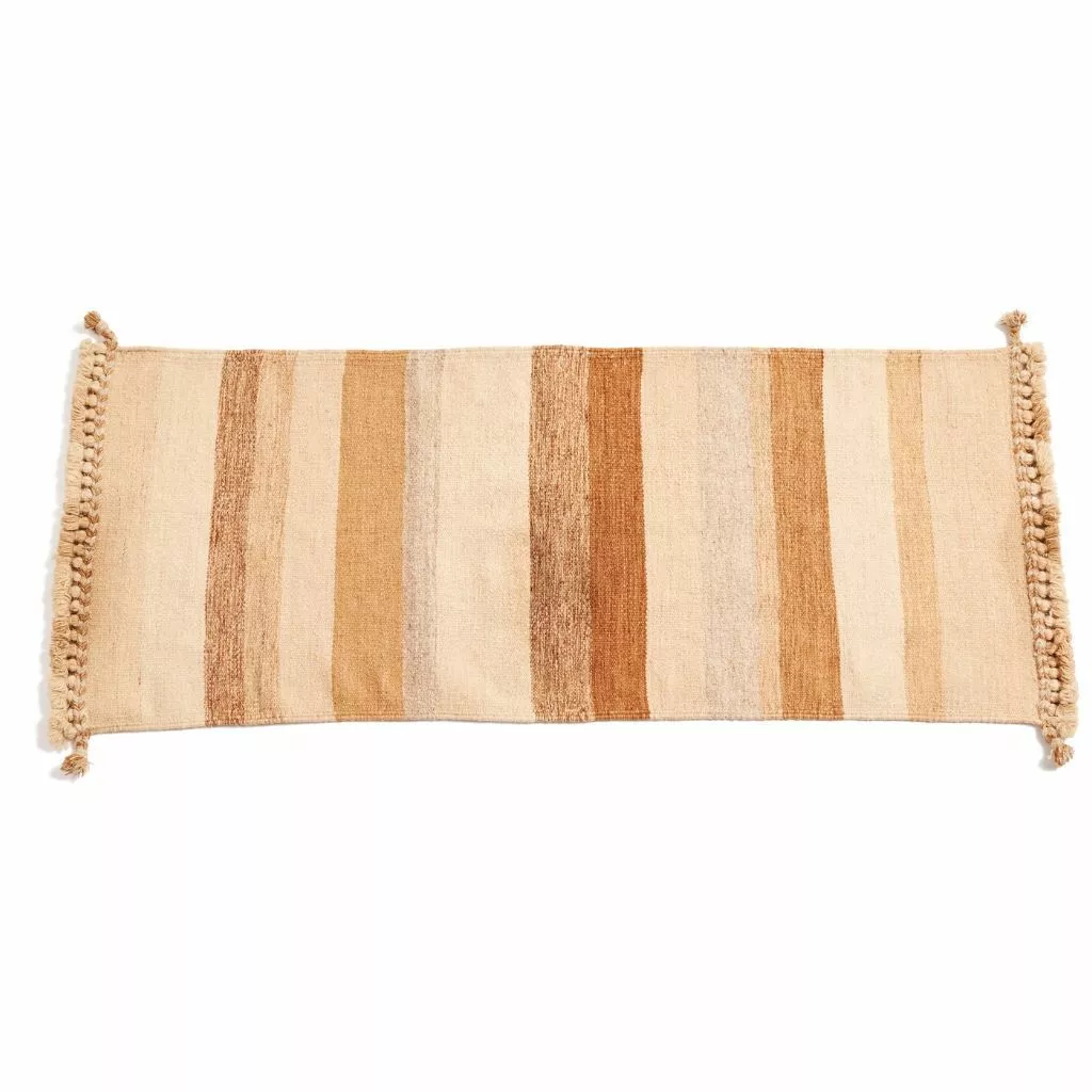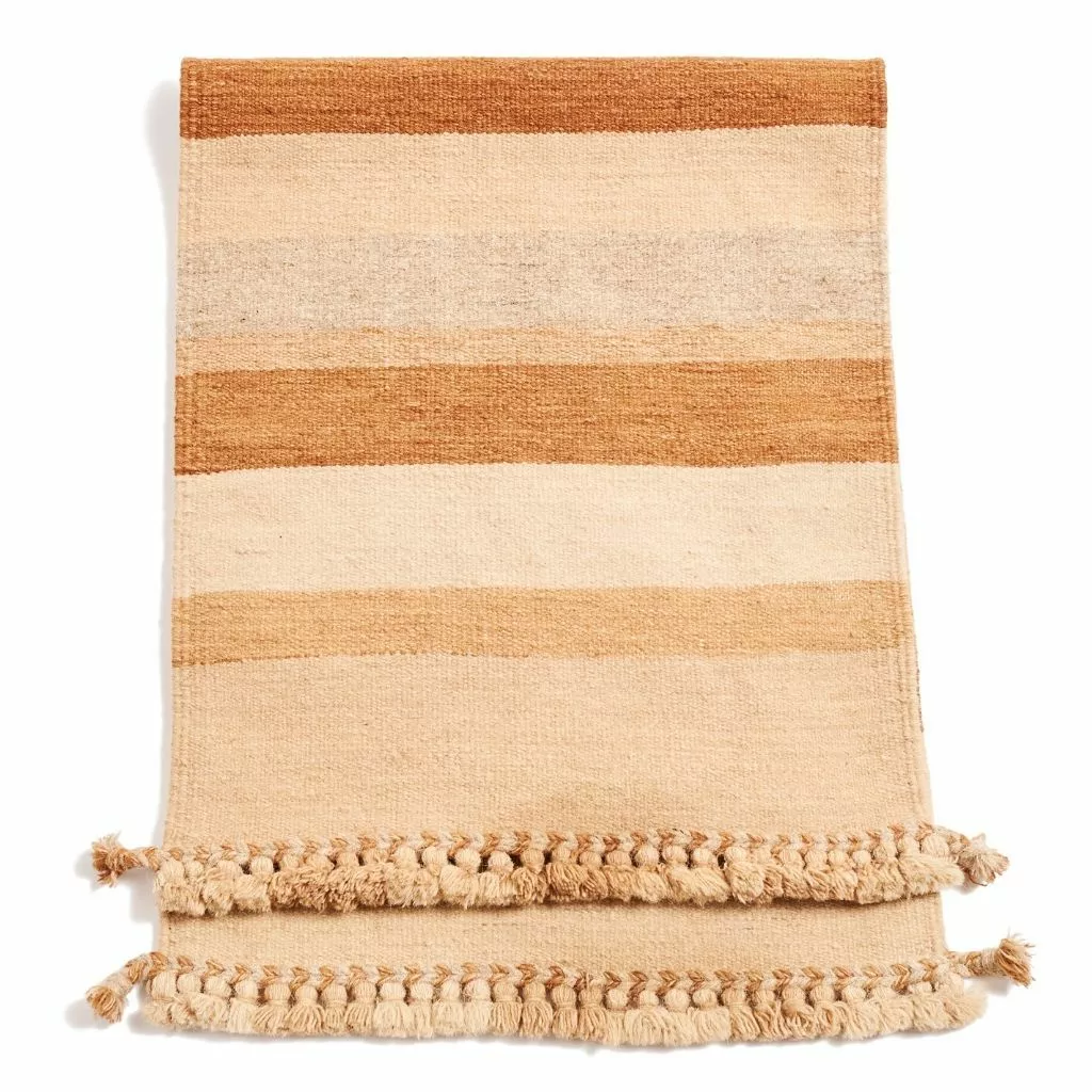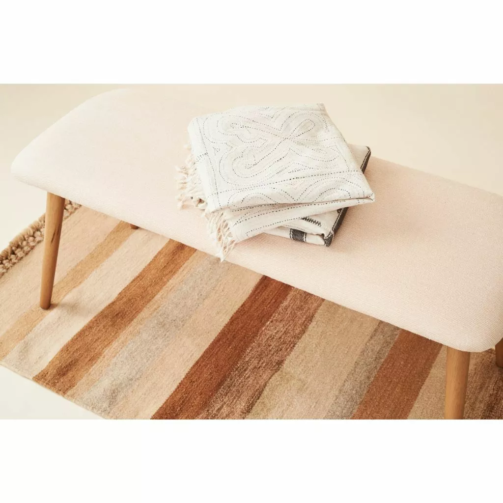 The Maati Rug is handwoven by a fifth-generation family of master craftsmen. They weave the Maati on an ancient loom that has been used in their family for hundreds of years. It is naturally dyed using organic materials like tree bark, eucalyptus, and herbs. Each batch of organic dye is made separately and custom to ensure richness in colors. The complete process is done by hand, which means each piece is unique and one of a kind.
