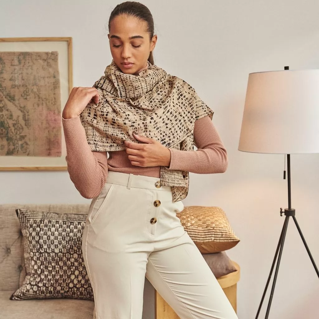 This beautiful silk scarf is a piece that offers modern elegance and timeless quality to any outfit. The seams of this silk are finished to give it a clean modern look. Tight winding of fabric creates the stripes pattern. The base color of the scarf is created by using dyes made from the acacia tree.