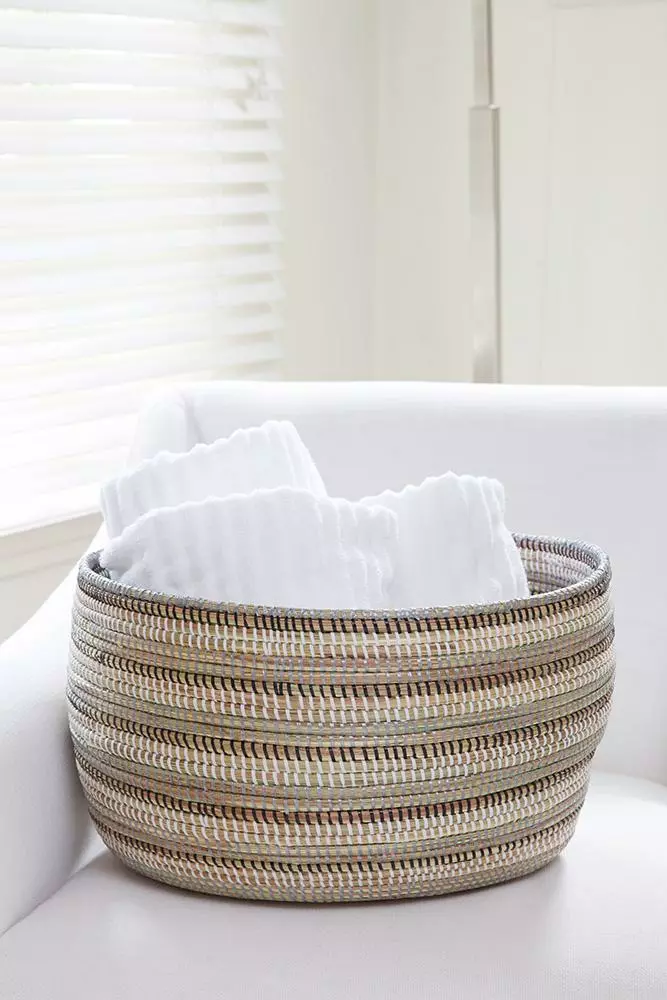 Swahili African Modern’s baskets and hampers are hand-woven by the Wolof women of Senegal who are traditional, artisan basket weavers. Each basket and hamper is made with natural cattails and reeds, accented by colorful strips of plastic from used prayer mats.