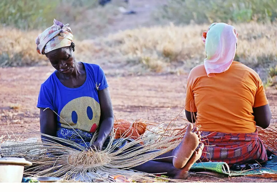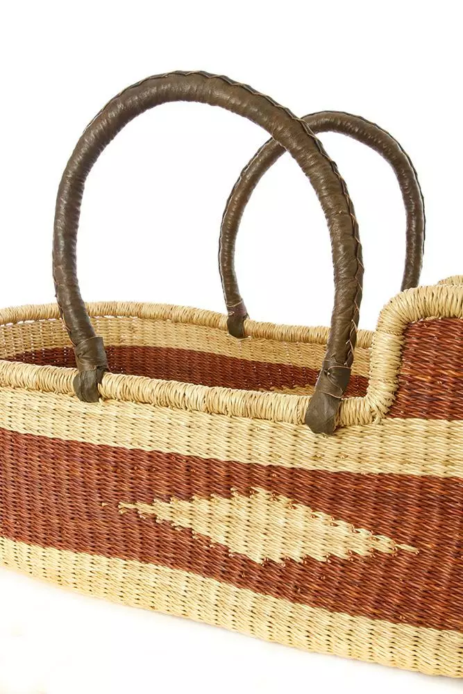 Ghanaian basket weavers handcraft this beautiful baby bassinet basket from stiff stalks of elephant grass. A beautiful diamond design is woven into a band of brown dyed grass to create contrast with the natural grass. Leather handles with a decorative contrasting braid offer added comfort. Because this is a handcrafted item, each may vary slightly.