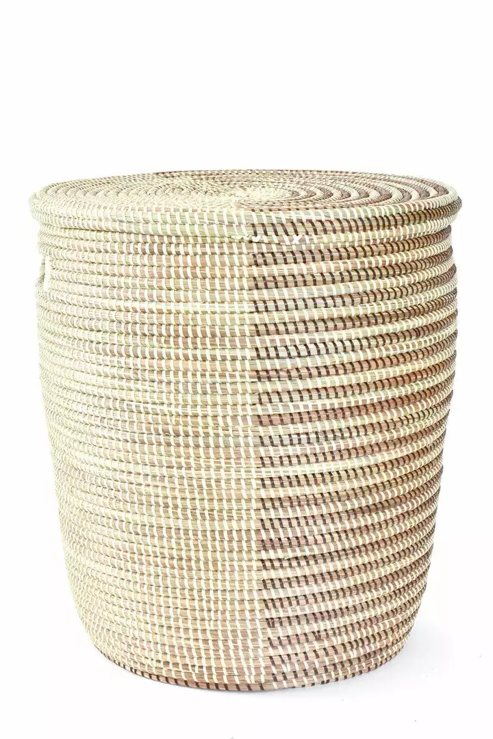 This classic-style laundry hamper storage basket features an overlapping lid and cutout handles. Wolof women in the West African nation of Senegal update traditional coil weaving methods by enlivening natural grass baskets with colorful strips of plastic salvaged from a mat factory. Cattails grow abundantly in rural Senegal, so women can earn a sustainable income from basket weaving while enriching homes around the world with modern African craftsmanship. Since this is a handcrafted item, each will vary slightly.
