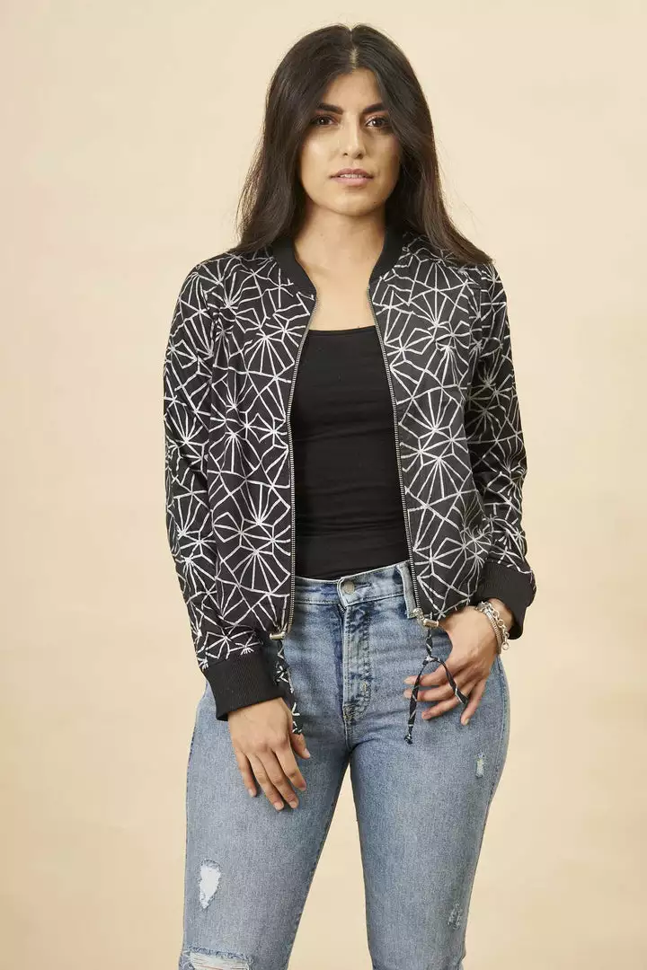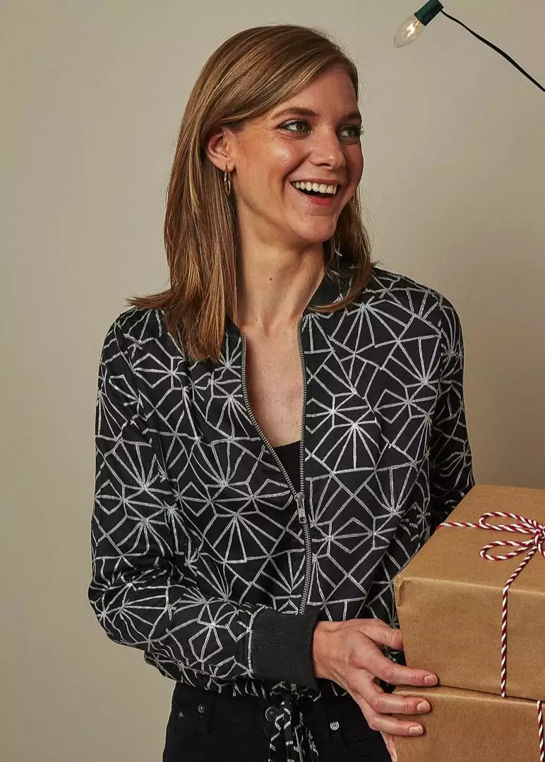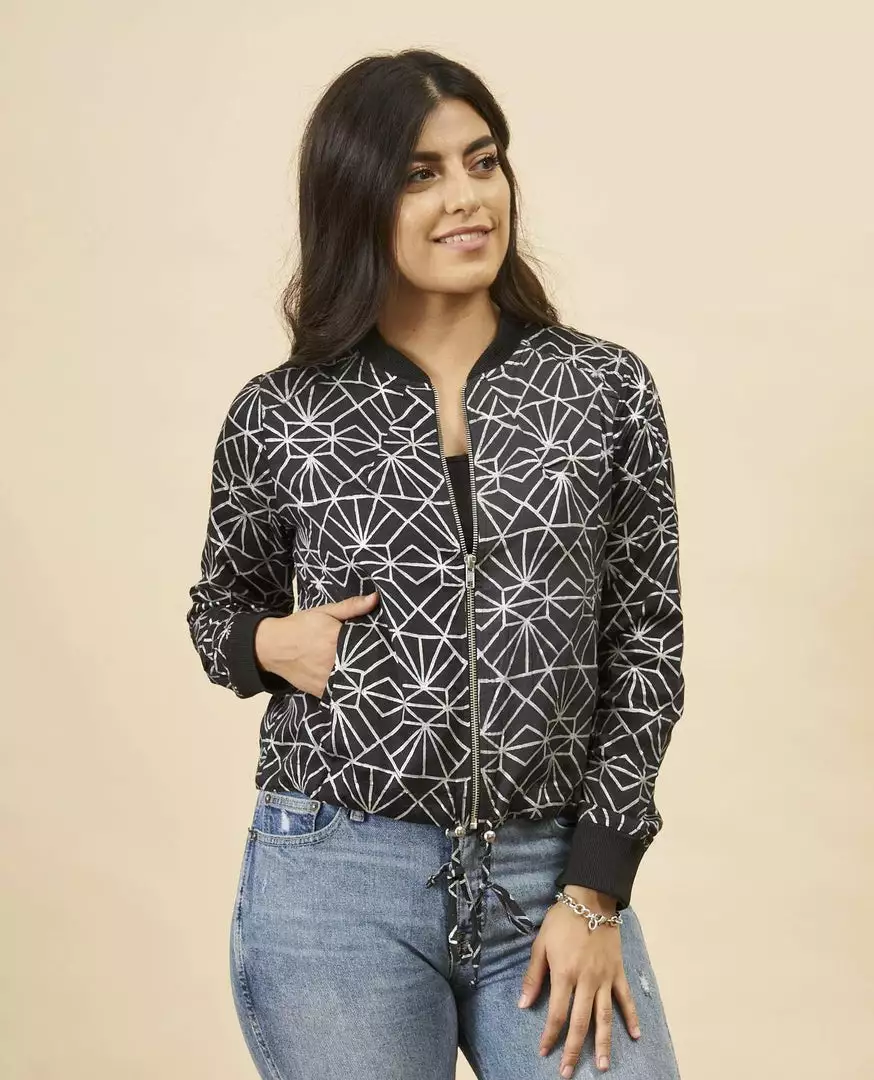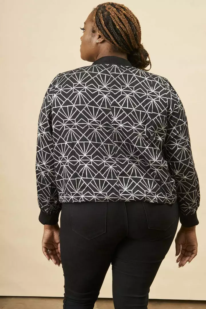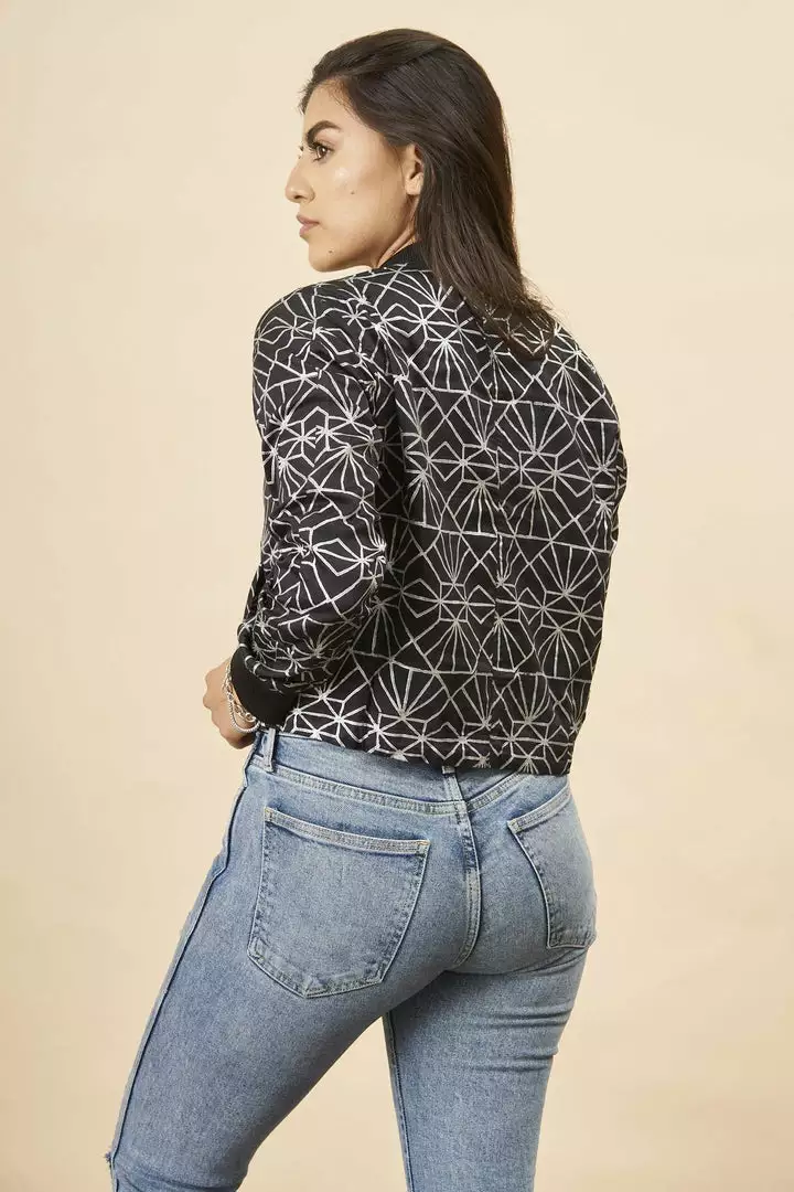 A classic bomber gets a vintage update with a print that mixes modern geometric design with a vintage 1920s twist. This stylish piece can be styled in a million different ways – making it essential for chilly nights. All of Symbology’s products are made by hand by women artisans who use traditional art techniques. Symbology is committed to sustainable manufacturing practices, paying livable wages to their artisans.
