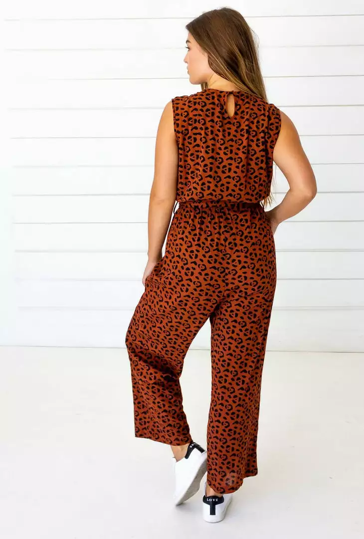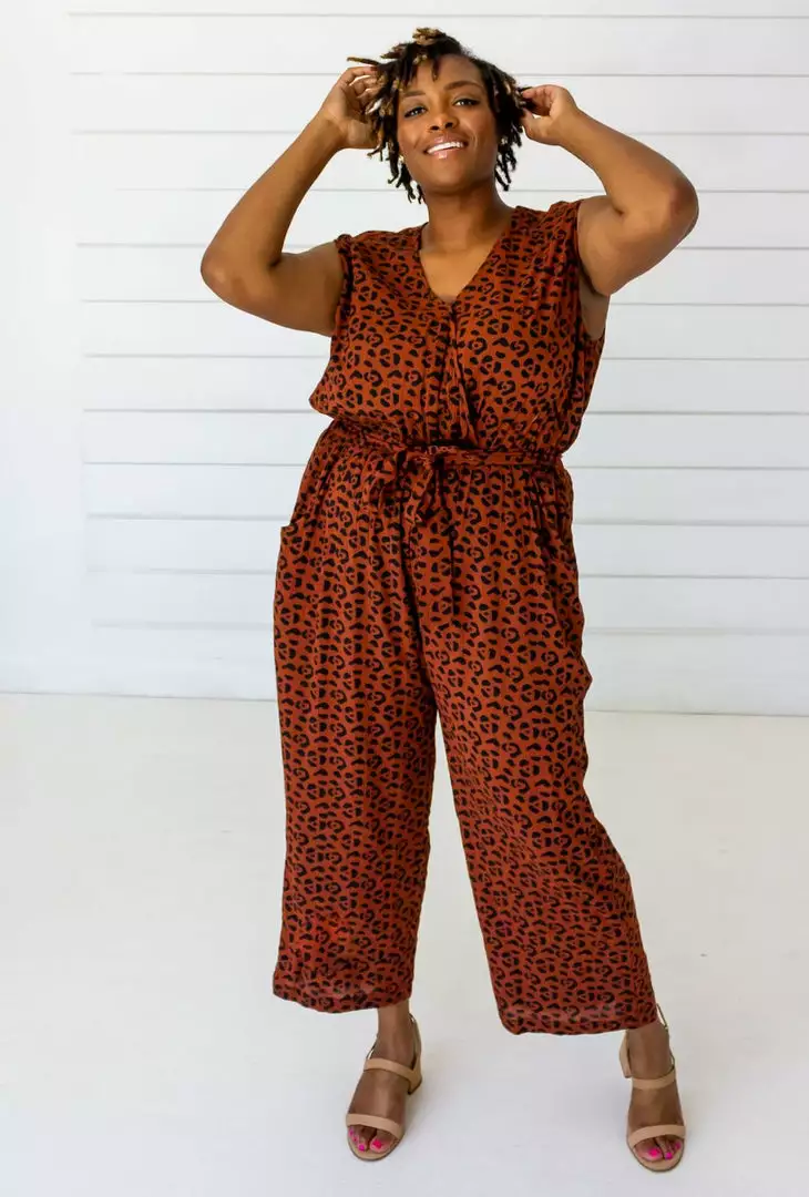 Embodying inner strength and beauty, this custom leopard print jumpsuit features a flattering elastic waistline, as well as a breast snap closure and back button closure. Handmade by women artisans in India.