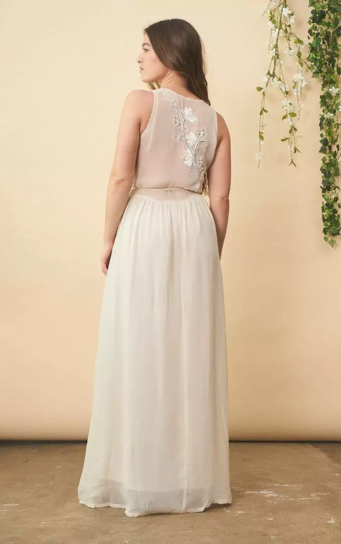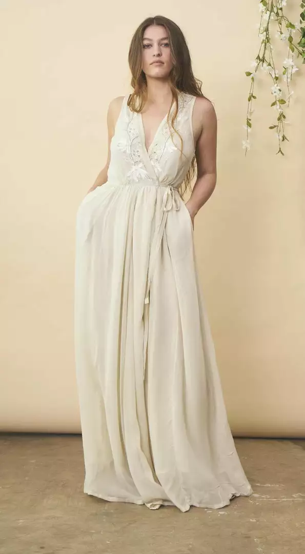 Your inner goddess will be fully channeled in this exquisitely ethereal dress, featuring a plunging neckline and intricately hand-embroidered botanical design. The semi-sheer back showcases beautiful embroidery crafted with delicate silver threads and tiny pearls. The adjustable wrap allows you to decide just how much coverage you want on your special day.