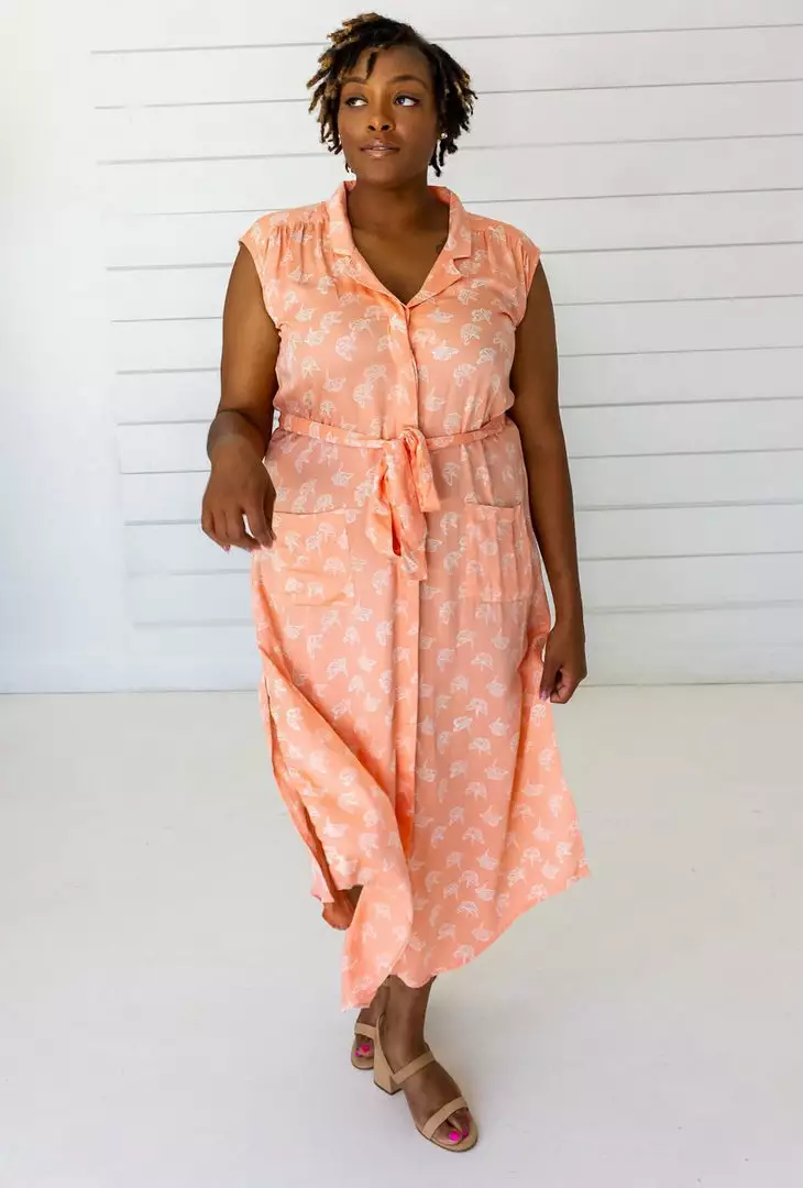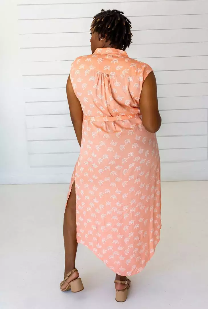 The ginkgo shirt dress was consciously designed to flatter and empower with hand-printed ginkgo leaves, symbolizing beauty and resilience. Handmade by women artisans in India.