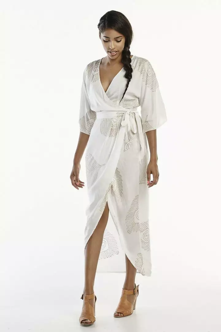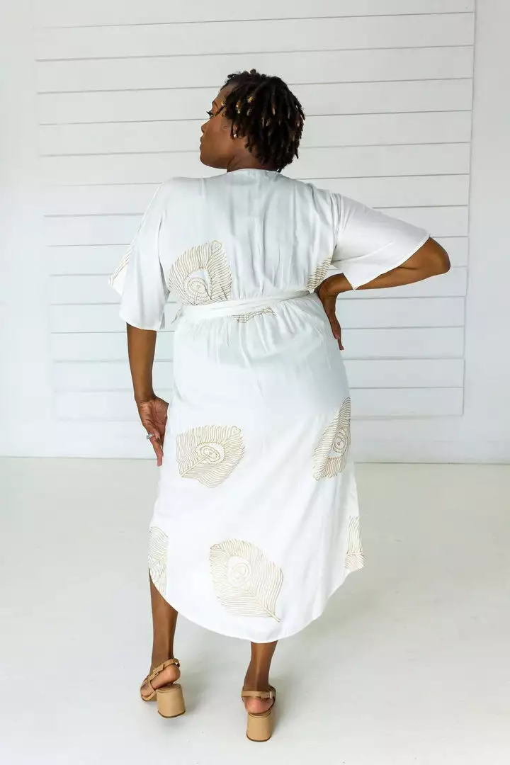 Their chic white and gold peacock printed wrap is made of buttery soft modal fabric (aka vegan silk) and cut to flatter all body types with an adjustable tie wrap. The natural plant-based fiber will keep you cool all summer long. Hand block printed by women artisans in India.