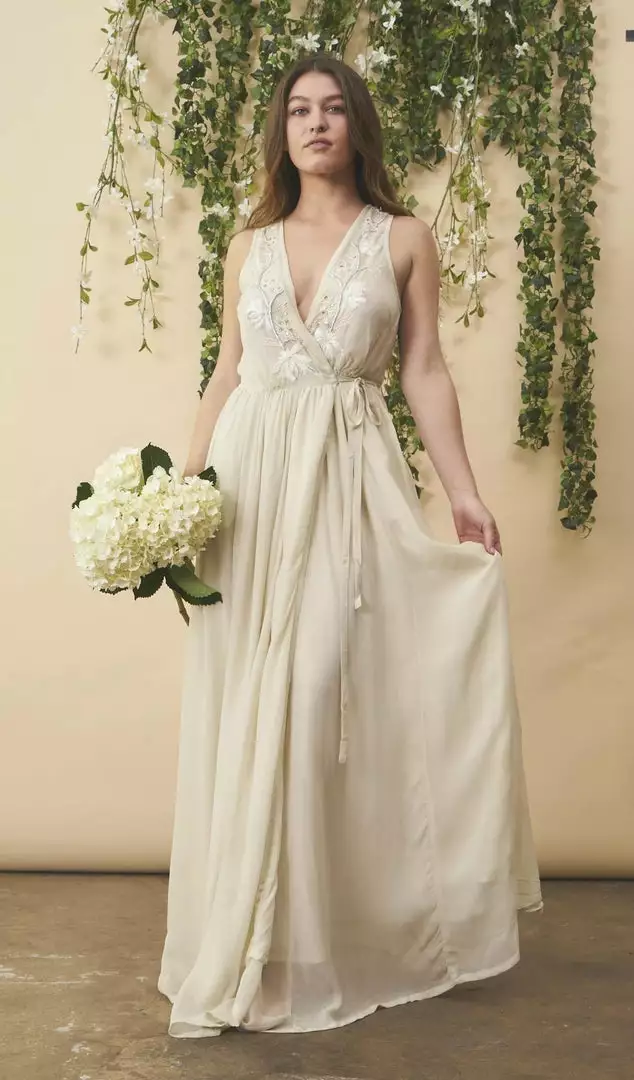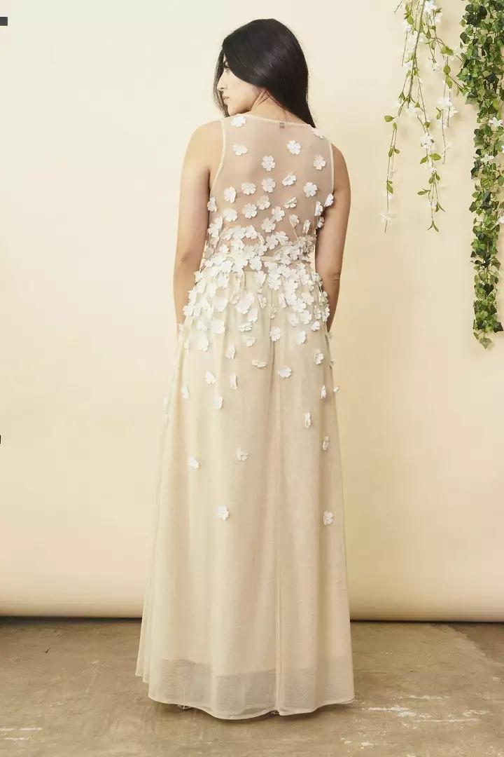 This beautiful gown features a cascade of floral ombre made from delicately hand-cut flowers with delicate pearls dotting the center. All of Symbology’s products are made by hand by women artisans who use traditional art techniques. They are committed to sustainable manufacturing practices, paying livable wages to the artisans and using eco-friendly dyes.
