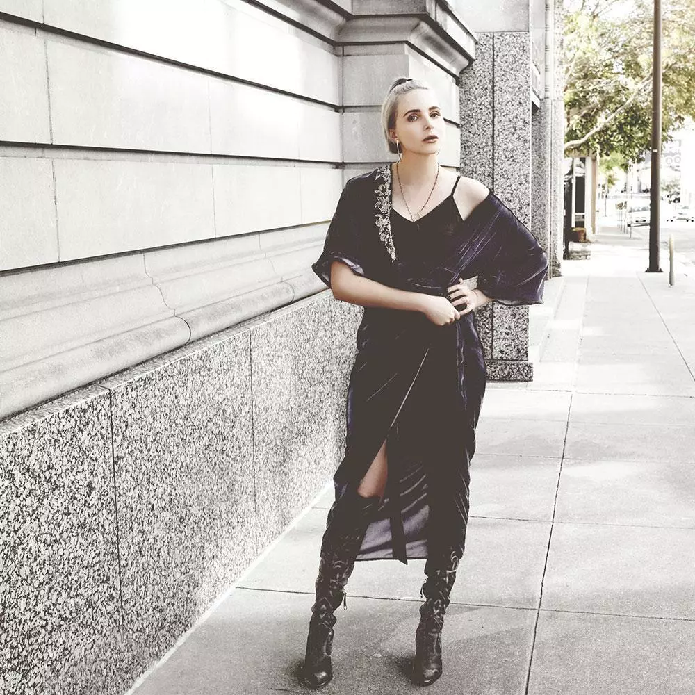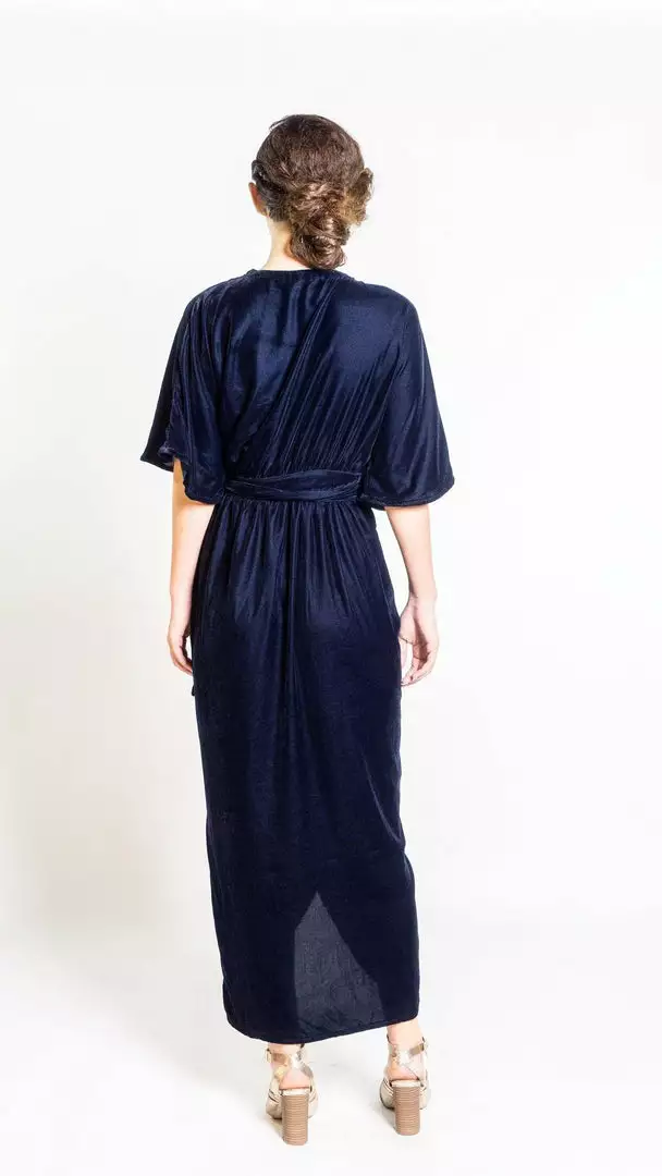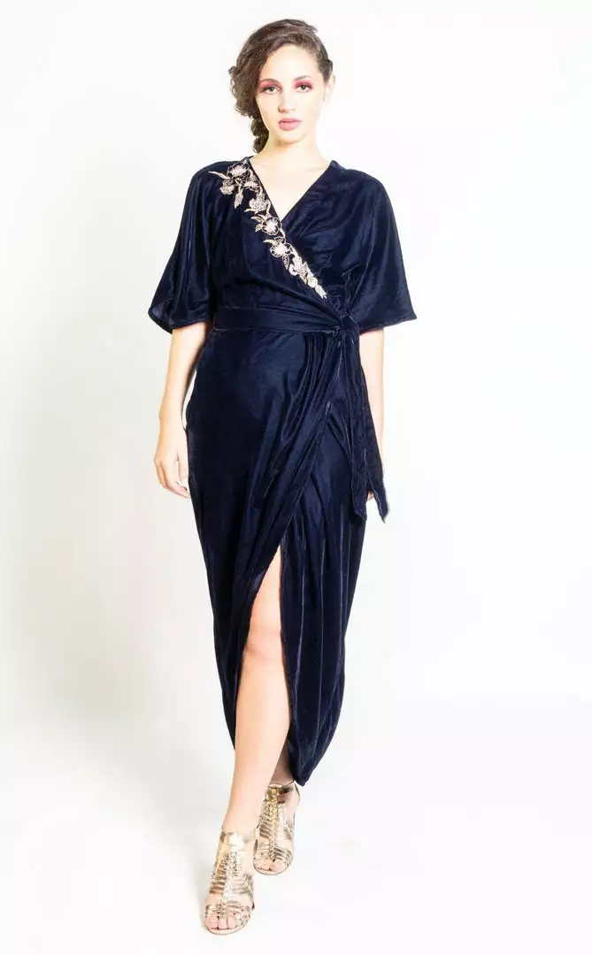 This gorgeous wrap takes the velvet trend to the next level of opulence. Soft midnight blue velvet hugs the body, highlighting just the right curves. A stunning hand-embroidered floral design pops in soft rose hues, gold threads, and tiny pearls.