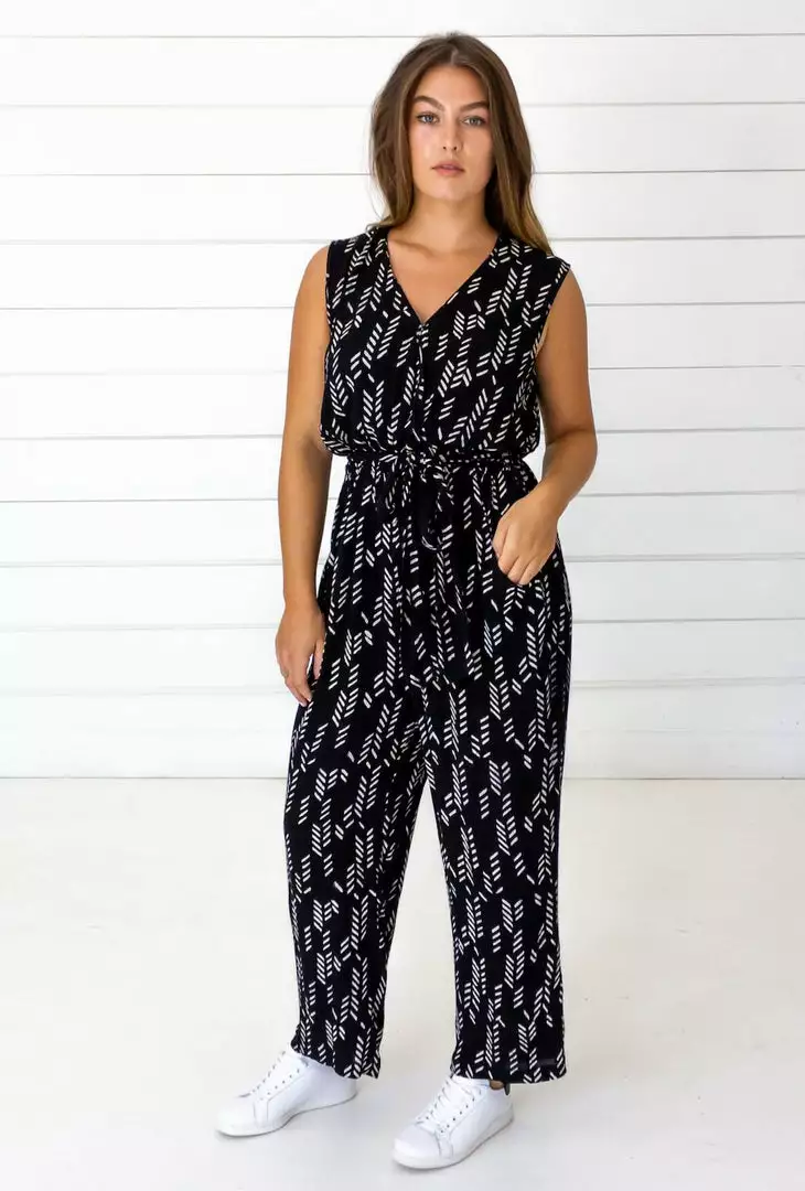 This jumpsuit includes an adjustable tie at the natural waist, a breast snap closure, and a back button closure for premium comfort. Their stylized feather print signifies honor and courage. Handmade by women artisans in India.