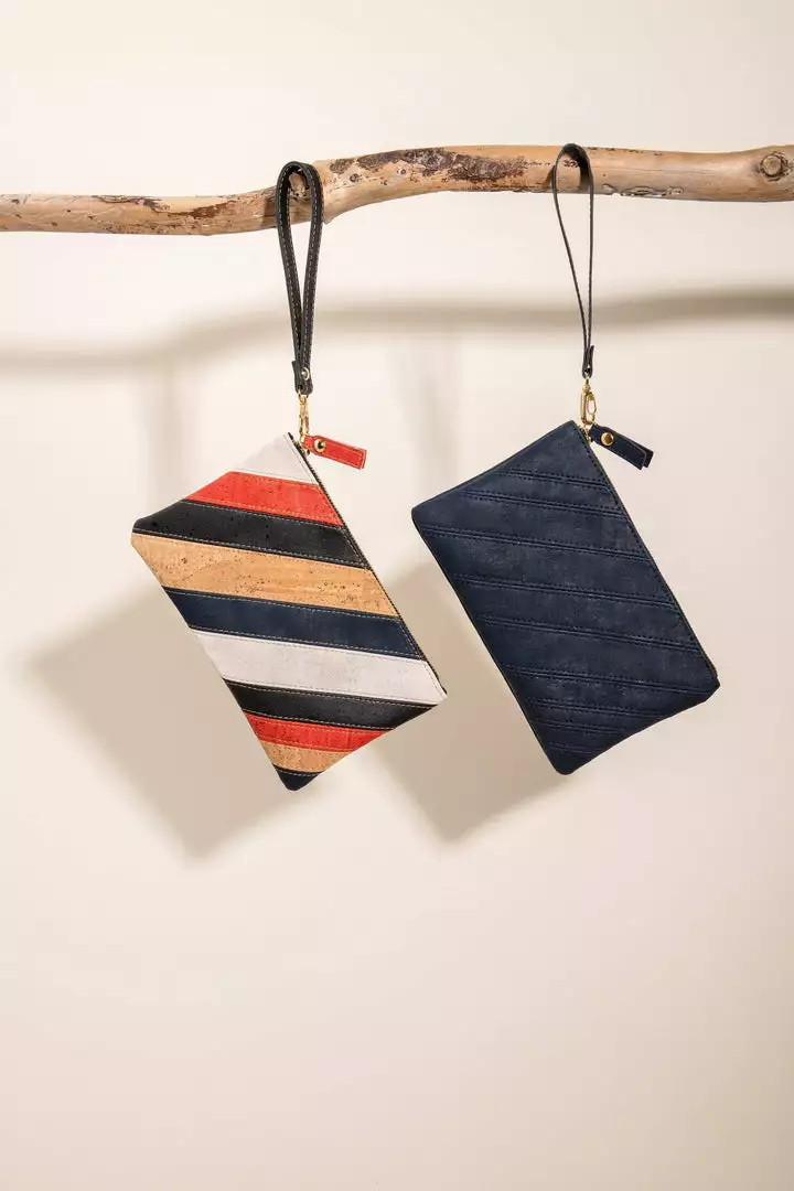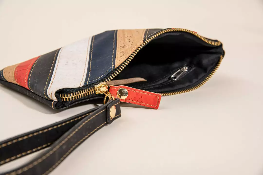Just the right size for your essentials whether its running errands, commuting and traveling or getting out to grab a quick bite with friends. Handcrafted to be used as a wristlet, clutch, or clip-on to a larger bag, this bag has a zippered top, interior zippered pocket, and double-lined cotton interior to keep your items secured and organized. Made from vegan, hypoallergenic, antimicrobial, waterproof, lightweight, durable, biodegradable and recyclable natural cork.