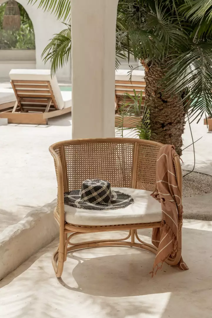 Keep the sun off your face and out of your eyes with this hand woven sun hat featuring an elegant plaid pattern and playful, frayed edge.