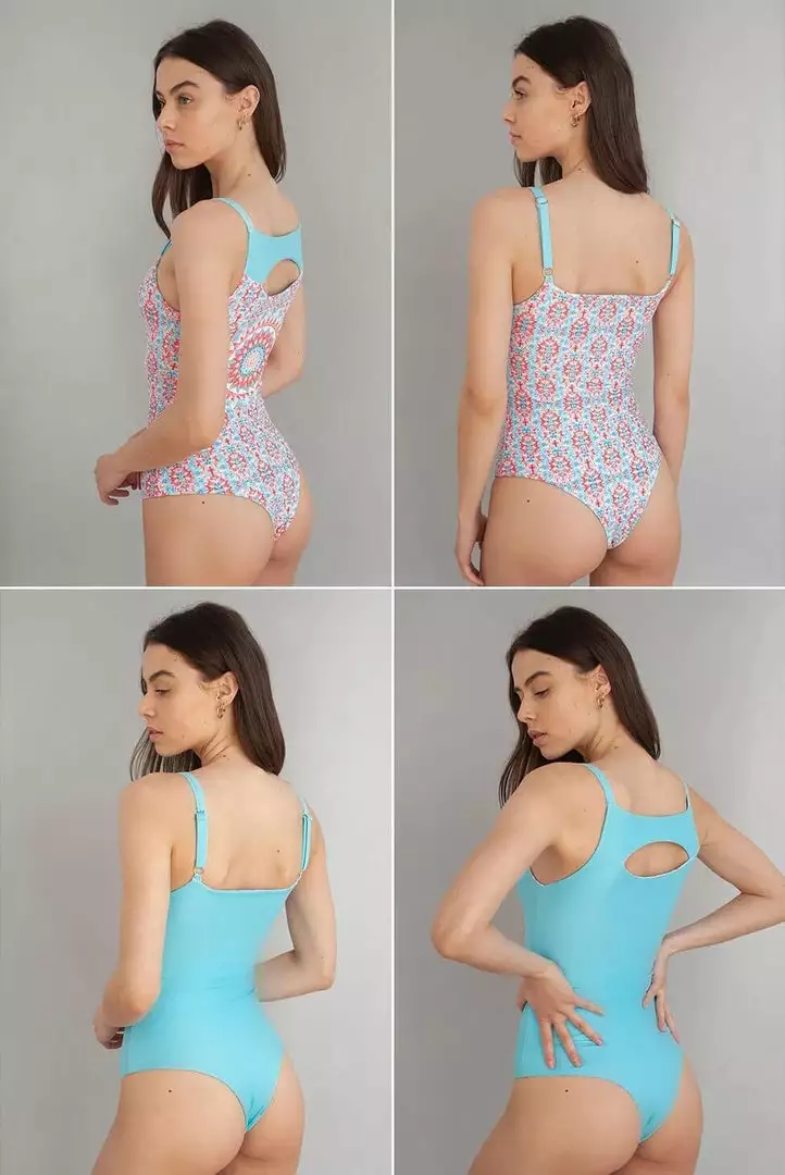 Featuring a pop of solid color on top, the cutout is easily worn in front and back, while the coral/turquoise print below transports you to the Amalfi coast. This bold and bright one piece reverses from basic solid turquoise to statement piece in a snap.