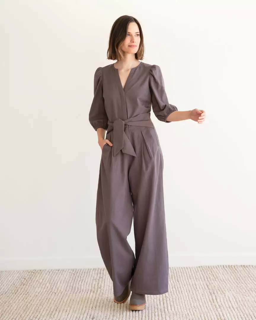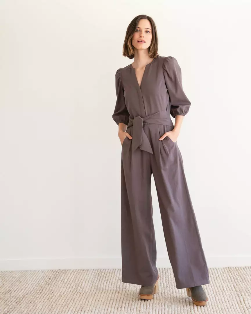 Clean lines embody this twill, autumn-inspired jumpsuit, featuring a front tie belt at the waist and subtle feminine puff-sleeve detailing. Made of ultra-fine 100% organic cotton – a minimalist design with maximum effect.