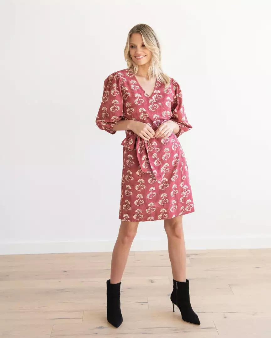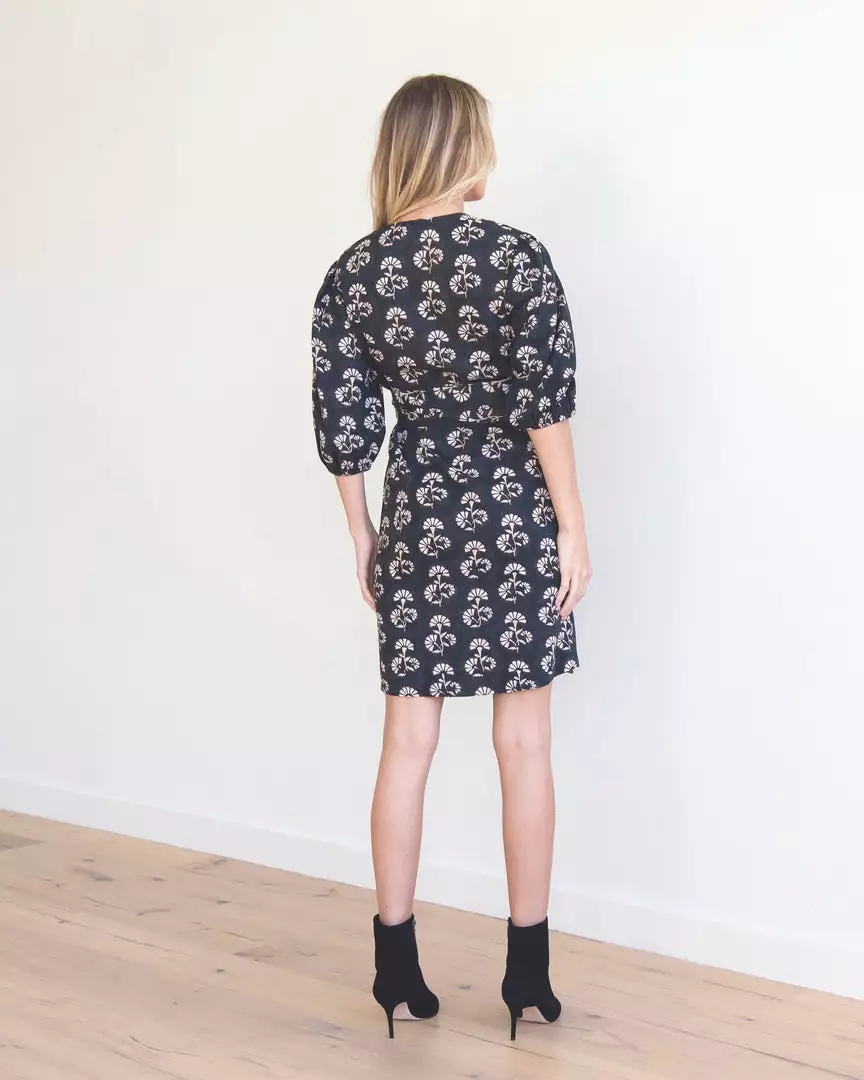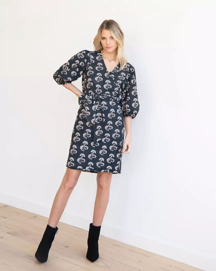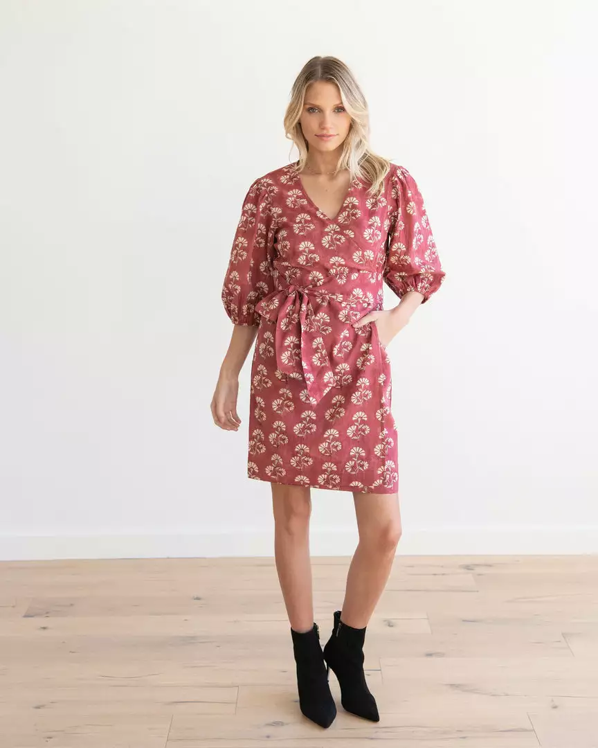 The floral, block-print pattern in the Beaux Dress is hand-stamped on lightweight, 100% organic cotton voile. A wrap-style dress with dainty puffed sleeves that hit at the elbow and a modest, just-above-the-knee length.