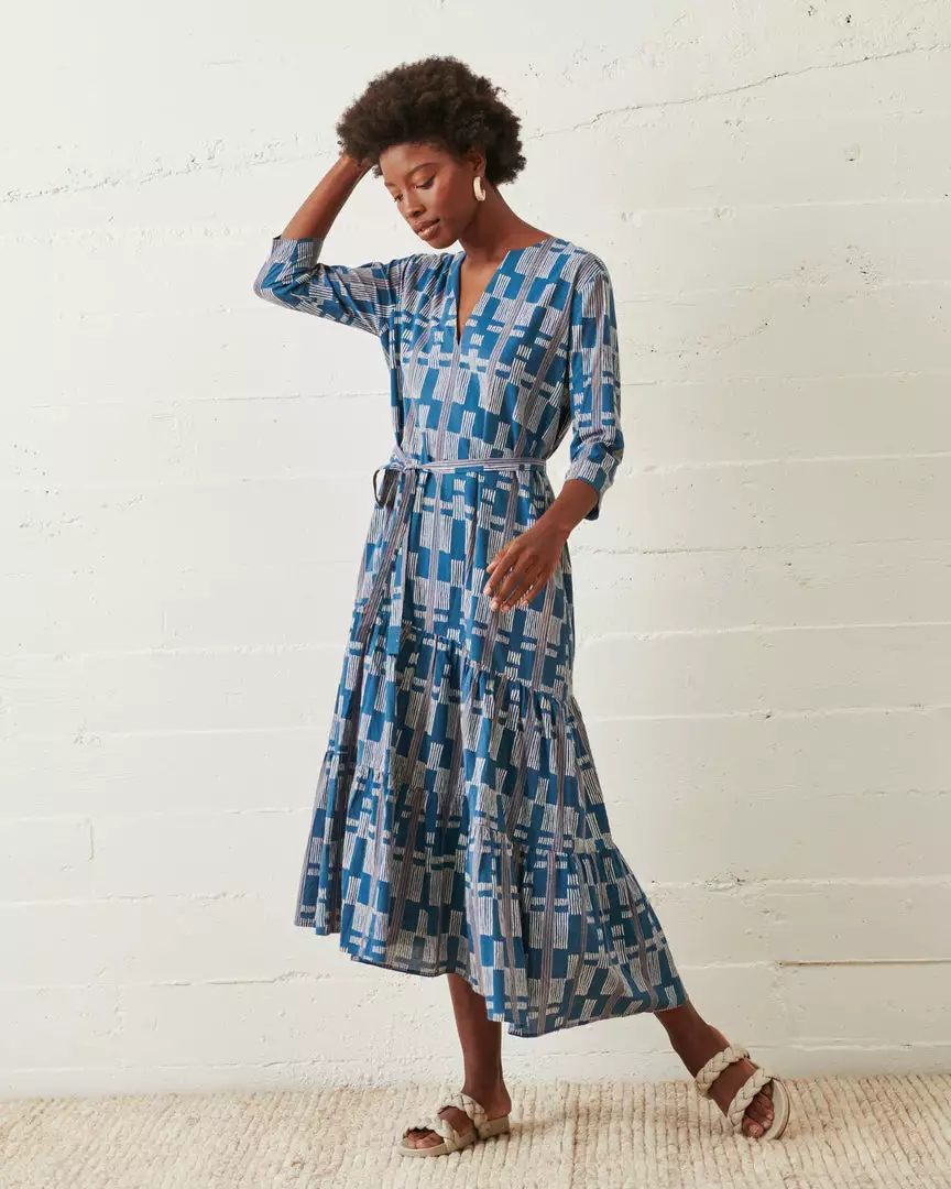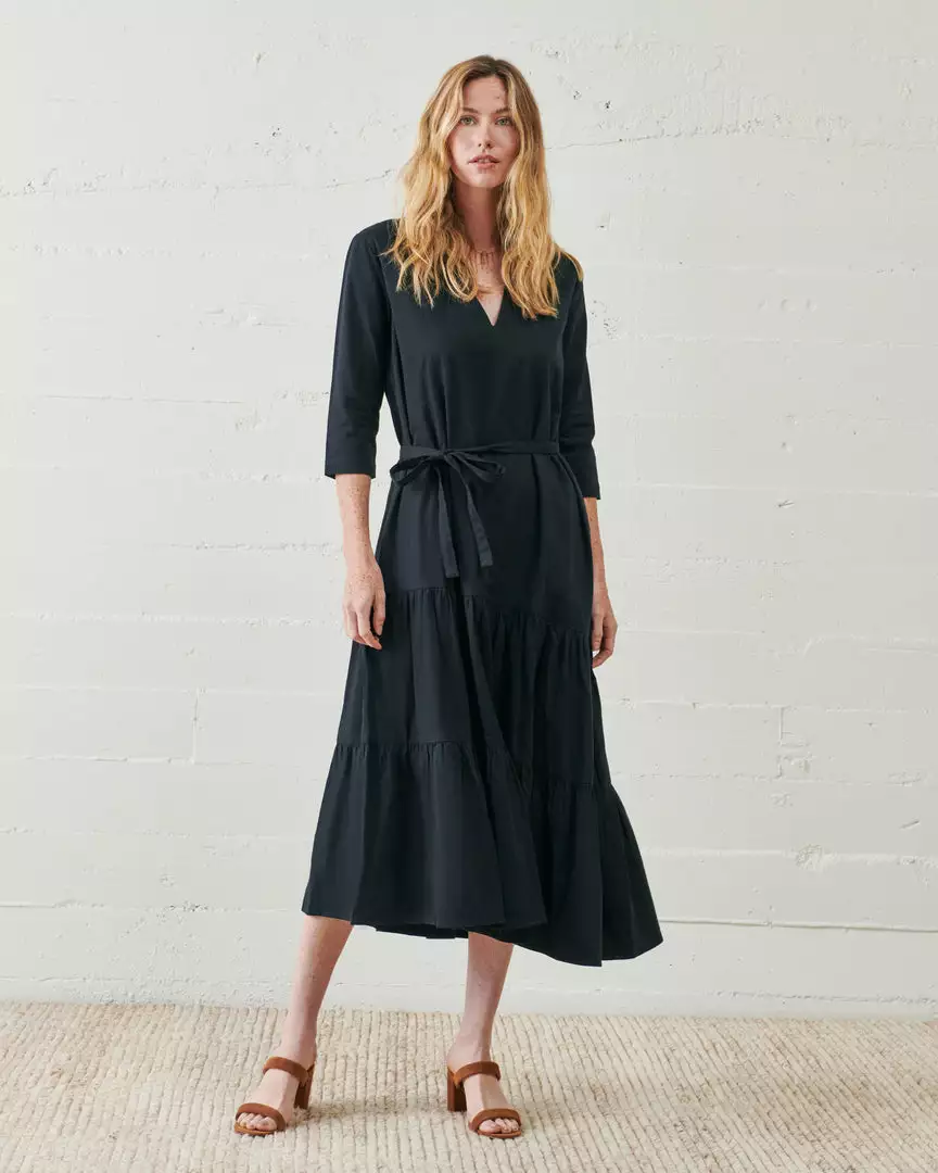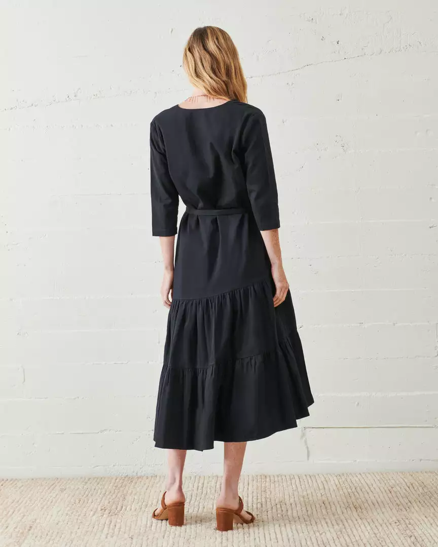 With a flowy asymmetrical tiered skirt, the Becca Dress is both refined and relaxed. This dress will grace your natural silhouette with fitted quarter sleeves and a belted waist. Finished with a clean V-notched collar and crafted from organic cotton, this is an unforgettable icon.