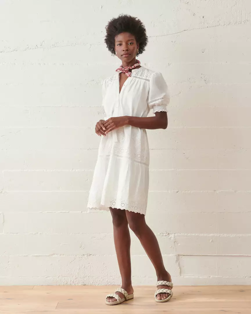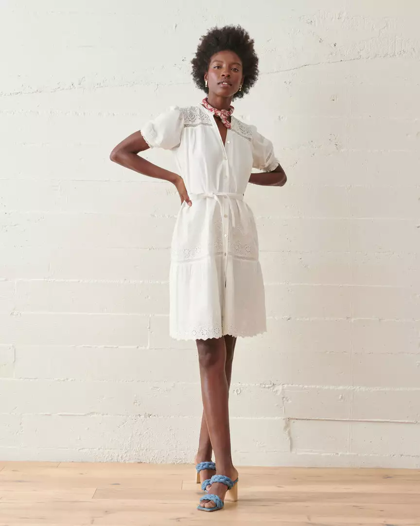 This dress gracefully falls just below the knee with a delicately belted waist and elastic shirring at the cuffs, creating a charming billowed effect. Crafted from clean, crisp, organic cotton, this is a lightweight timeless spring to summer piece with delicate eyelet details.