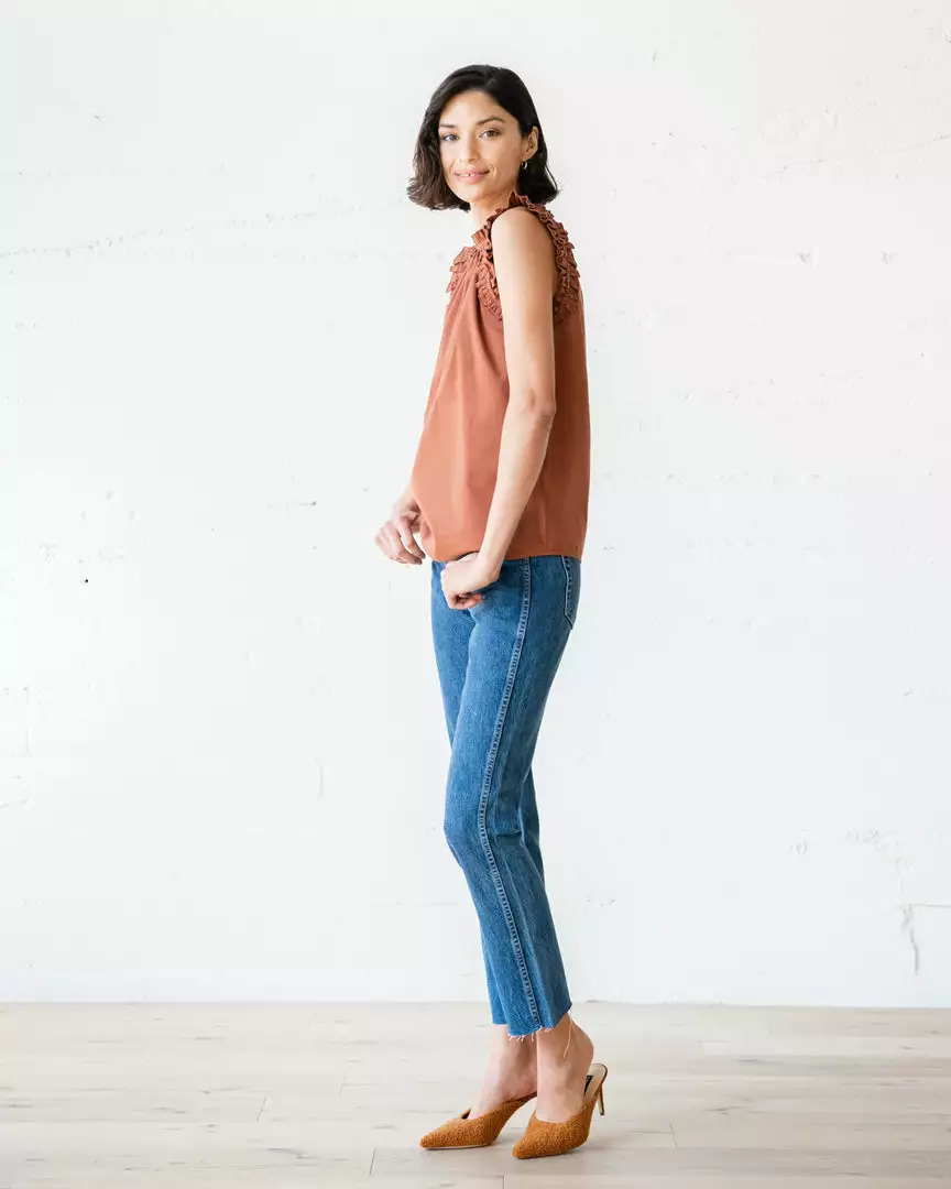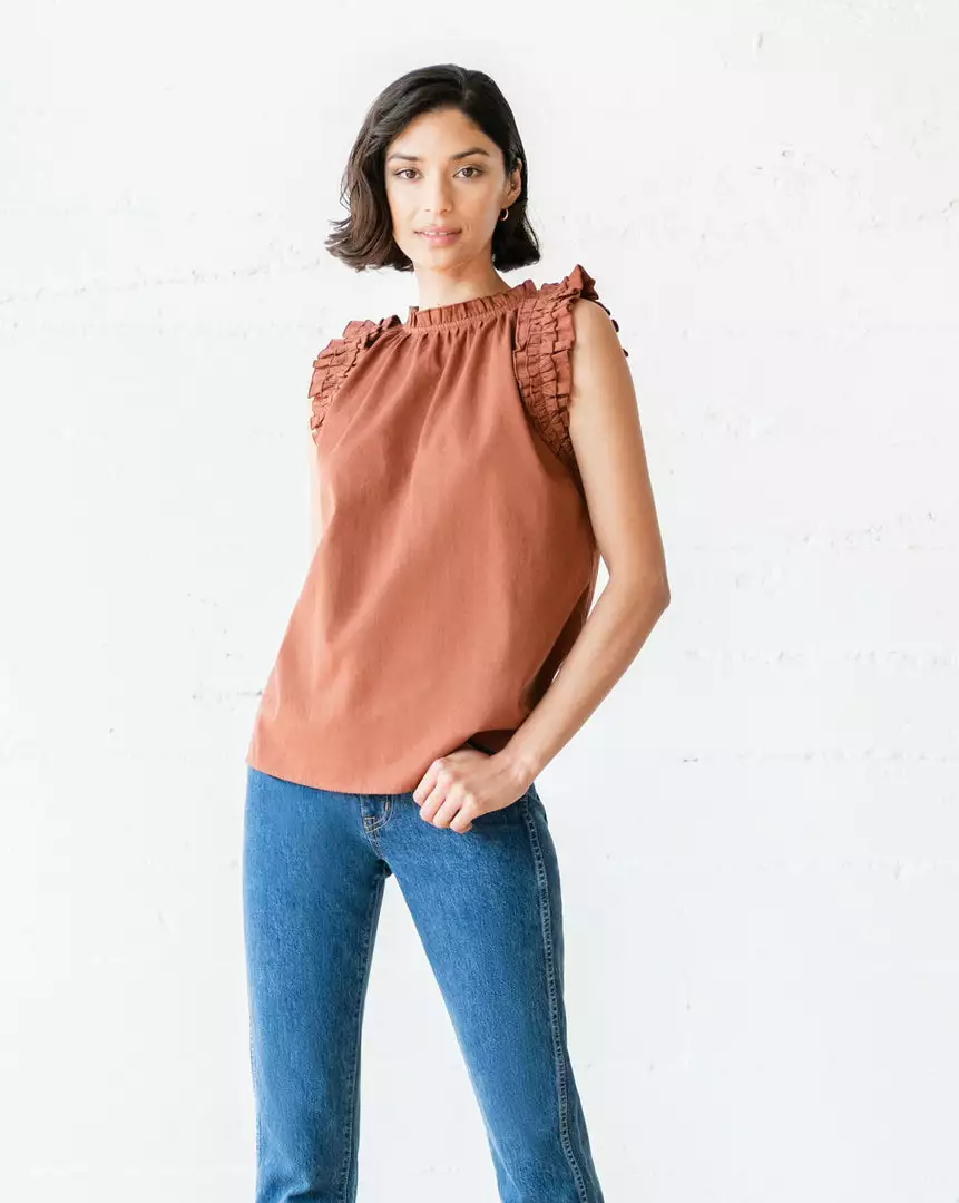 The Octavia Top is made with premium organic cotton eco twill with gathered, ruffle detailing at the shoulder and a feminine mock-neck, fastened by a single shell closure at the back.