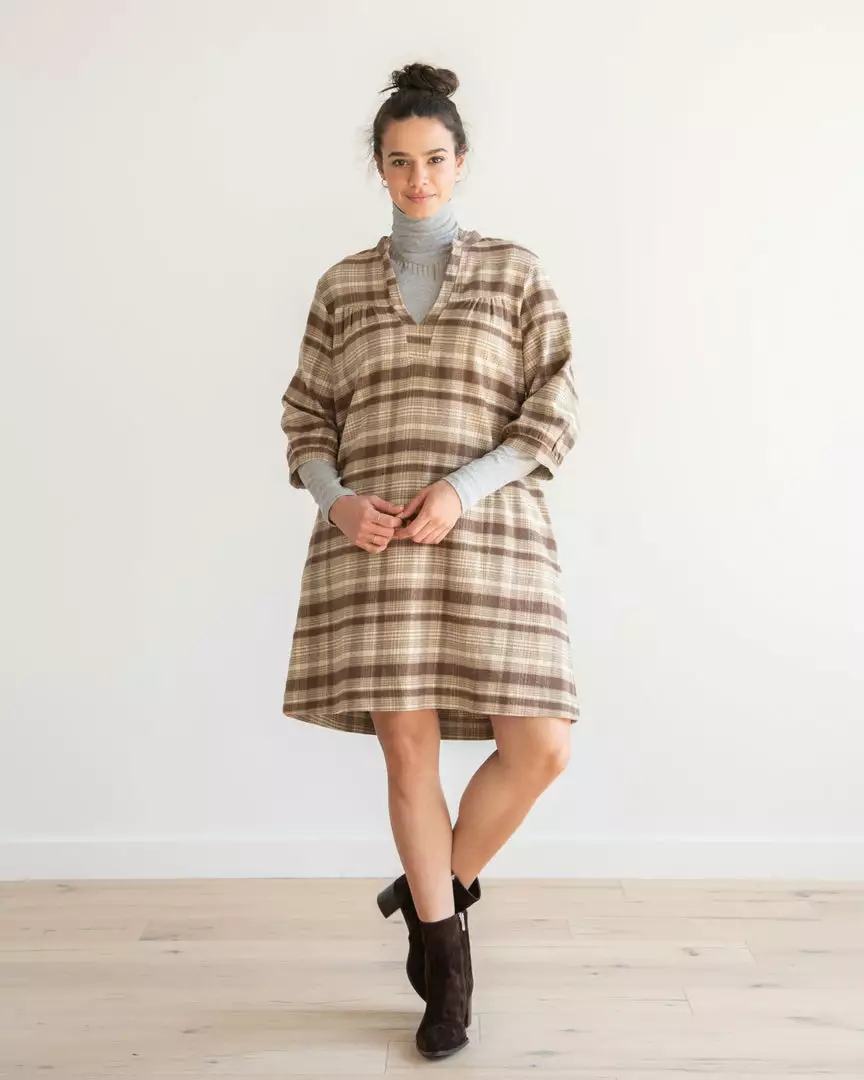 A clean palette of warm neutrals with an earthy plaid print, this carefree shift dress features a notched v-neckline and dainty puckering along the collar and at the sleeves. A statement in simplicity that will take you from season to season.