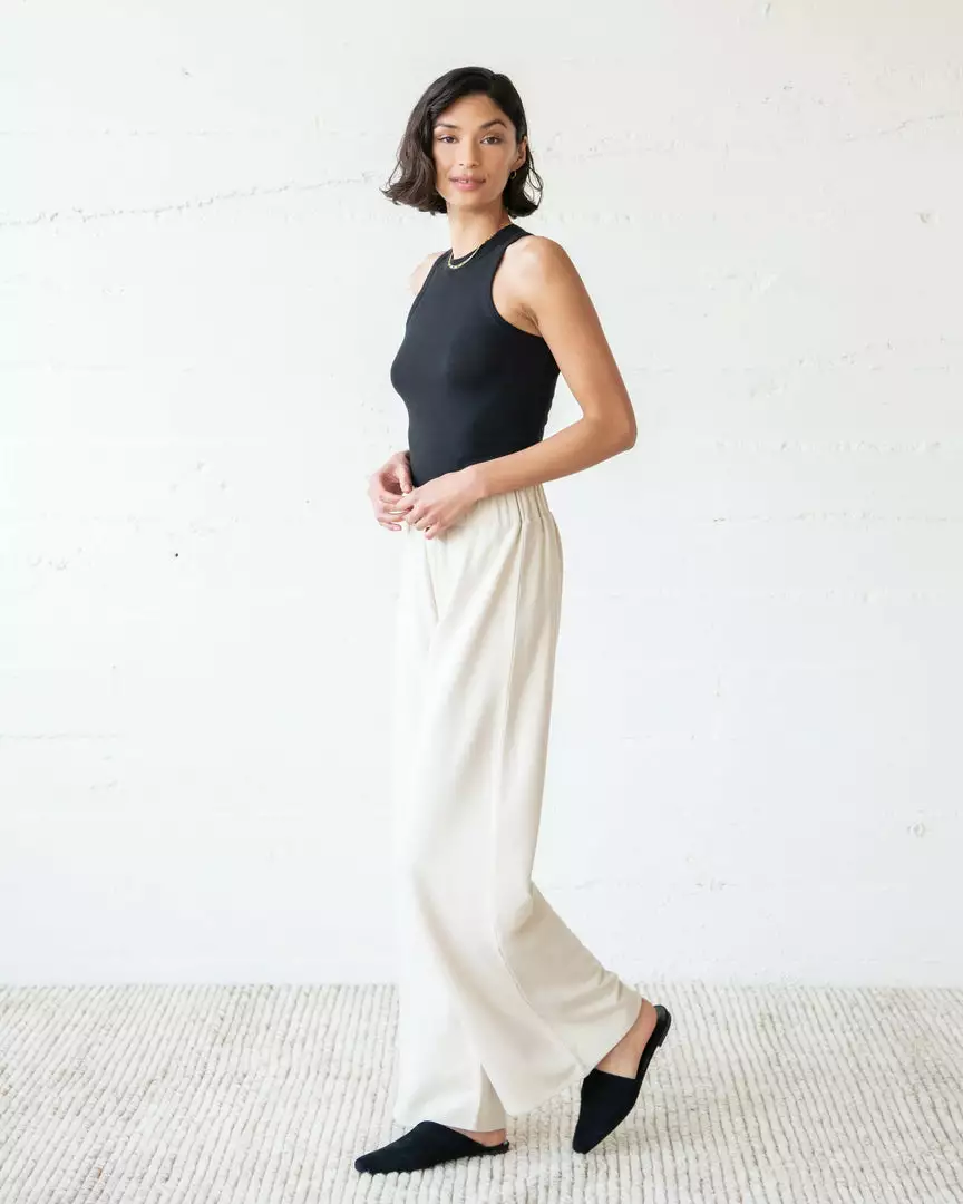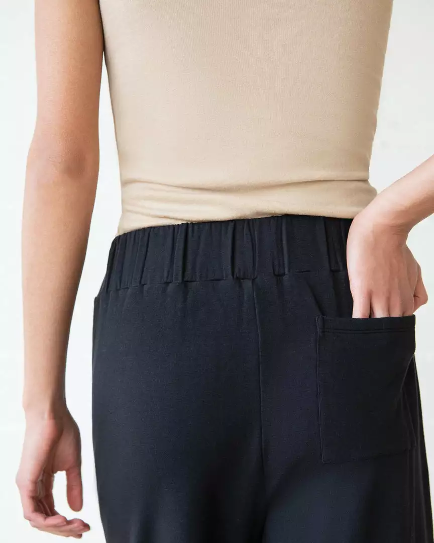 The Relaxed Pant has soft fabric with comfortable airy, wide-leg. Featuring an elastic gathered waistband and a single rear patch pocket.