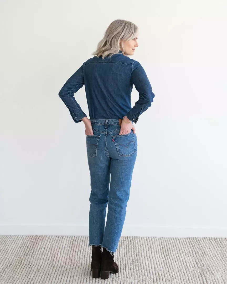 The western-inspired cotton chambray denim True Blue Shirt is built to last. It features double-breasted patch pockets, snap closures, and slim-fitting silhouette.