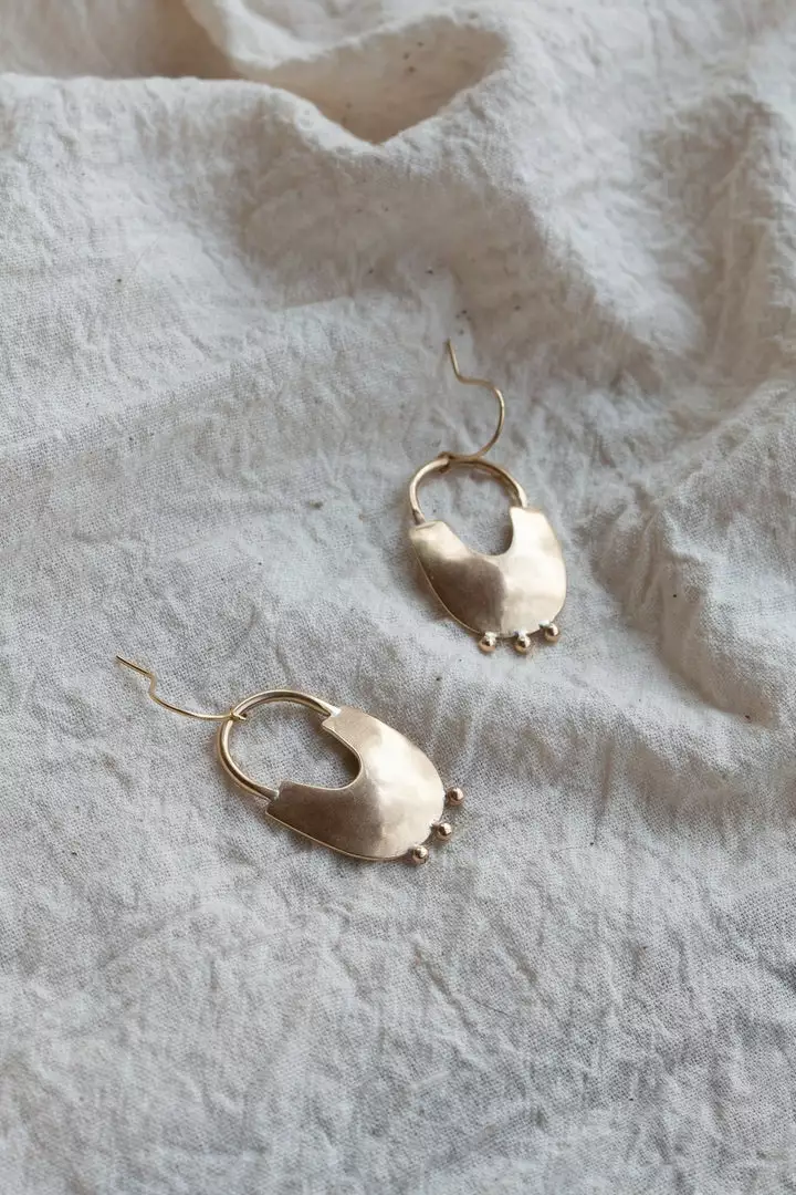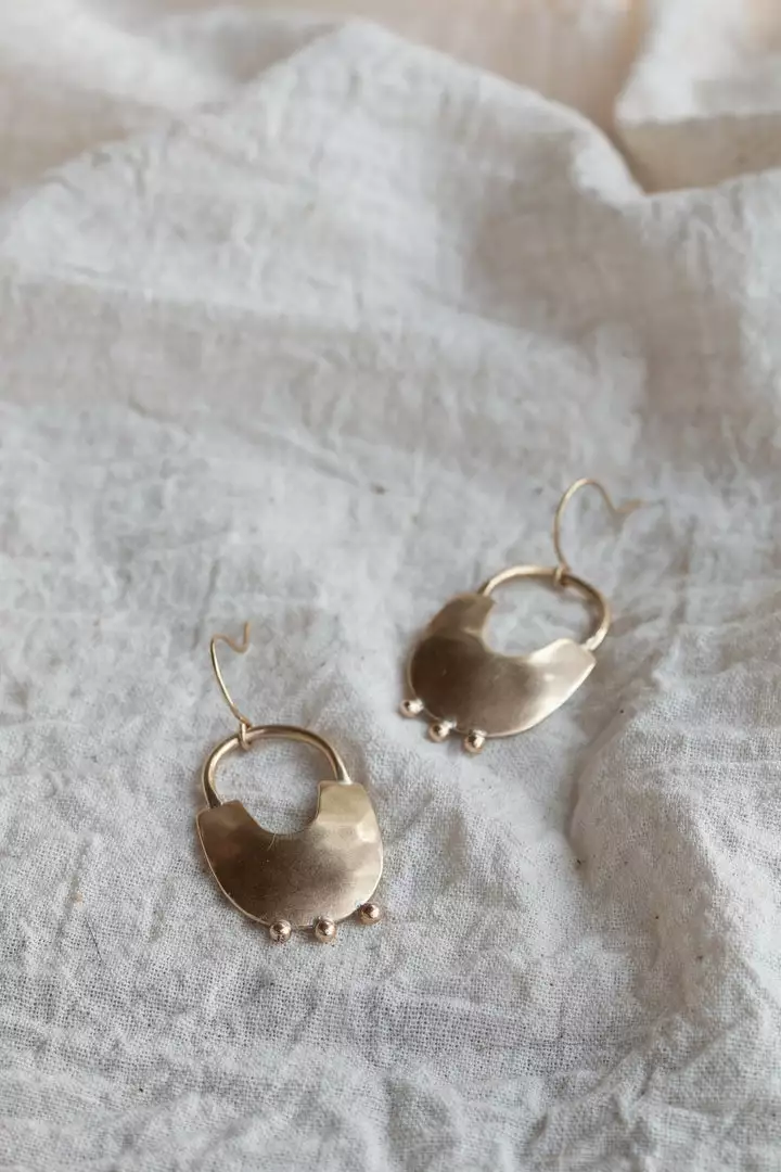 Hand-forged from recycled brass with a slight domed shape and nickel-free hooks, the Bamasha earrings offer a playful sense of motion and dimension. No two pieces are identicalβ slight variations should be embraced.