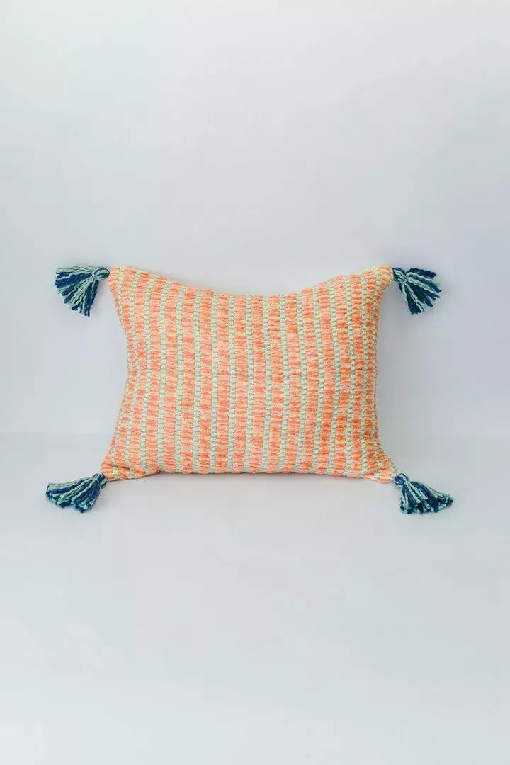 This adorable toss pillow features a soft weft-float weave in bold colors with corner tassels as accents.