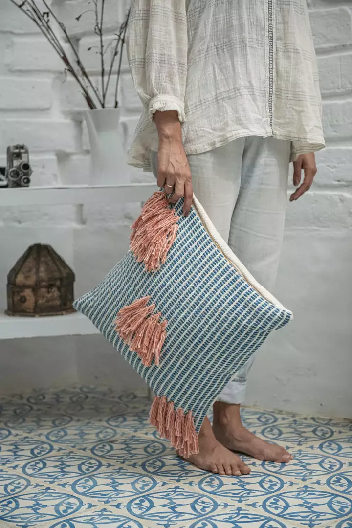 The Naidi, commonly known as açai, grows in the pacific tropical rainforest of Colombia. The Naidi Square pillow with Guayaba pink tassels is a strong, colorful and bold statement piece. Featuring indigo and soft sky blues together with sections of abundant orange and salmon colored tassels, this pillow is for the wild at heart, looking to bring life to any room.
